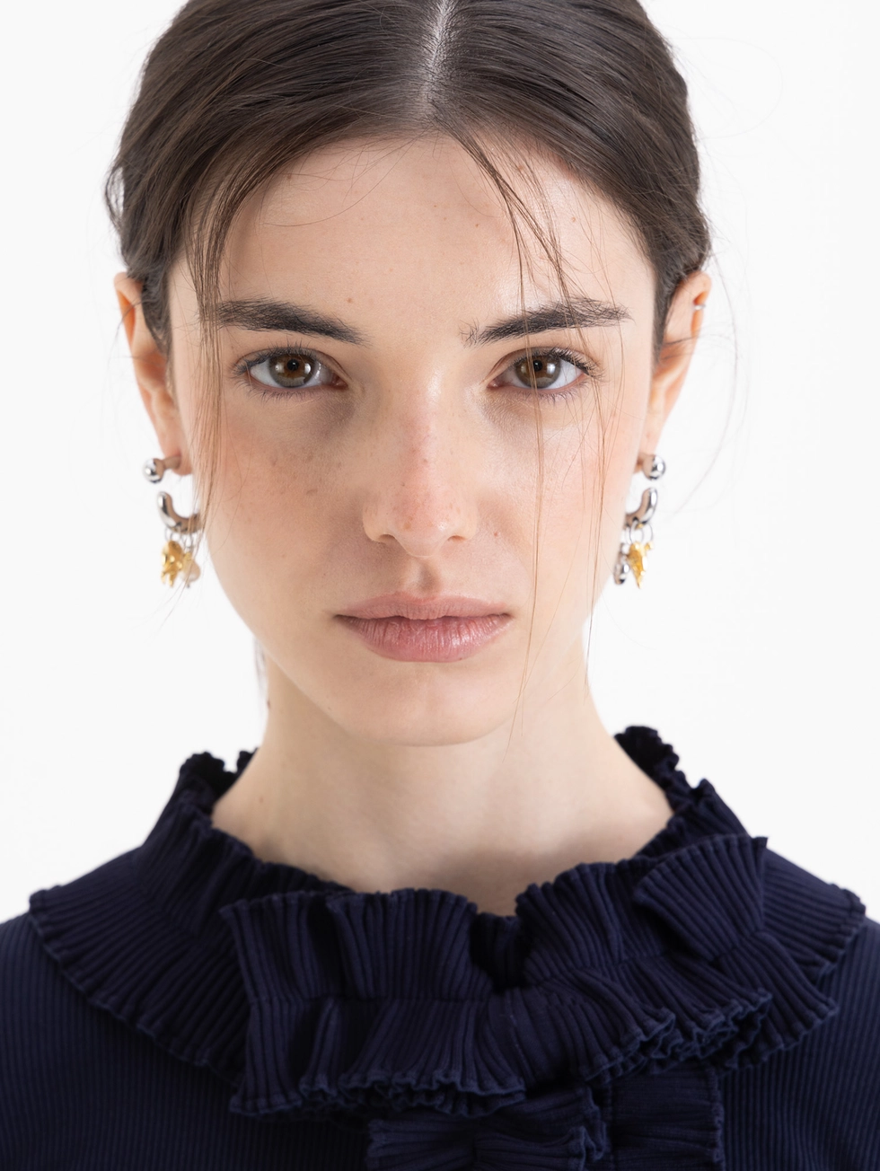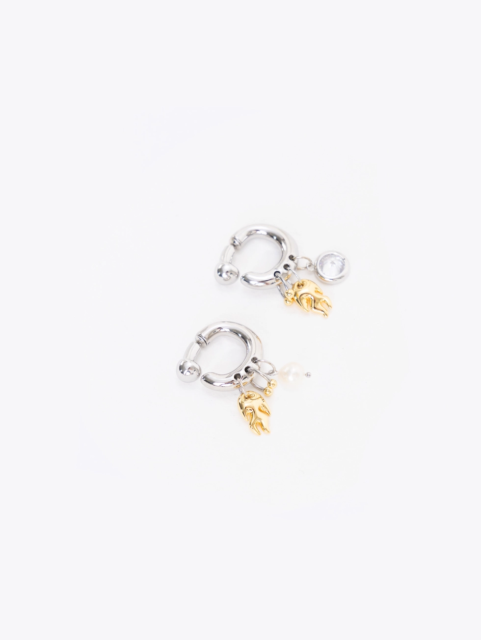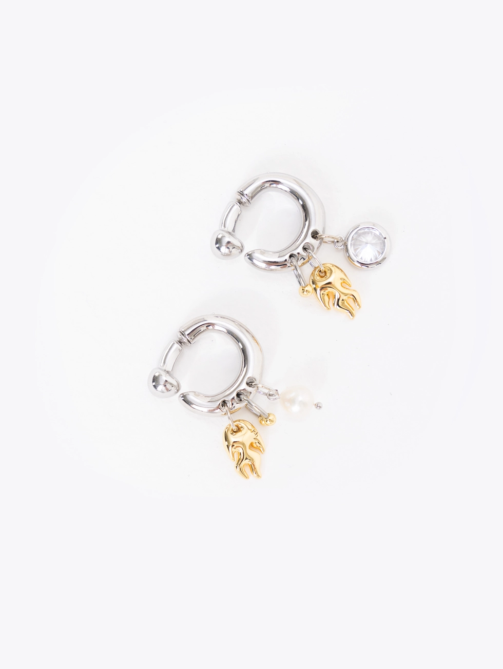 Aros Fire tipo argollitas con tres charms colgantes en combinación de baños metálicos.