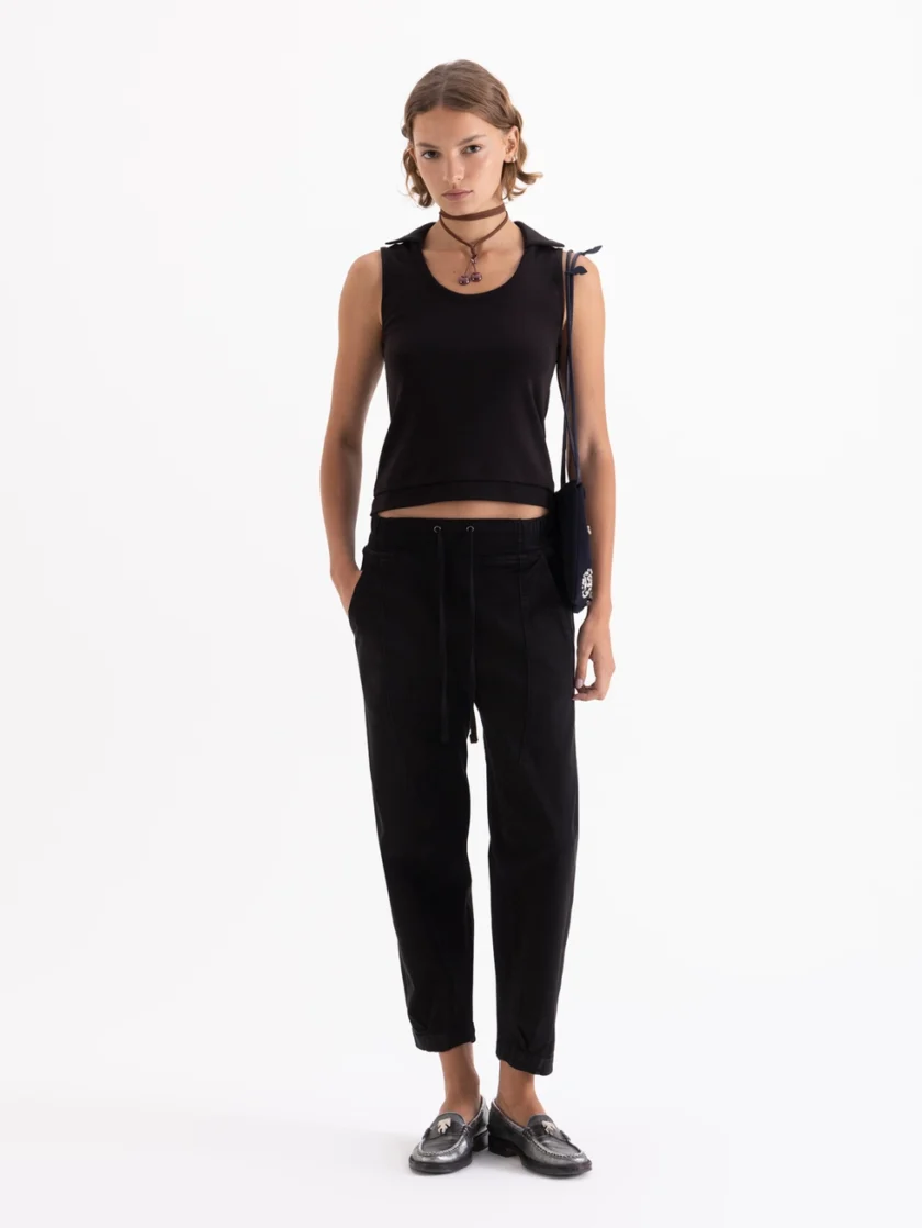 Babucha Andorra de tiro medio y cintura elastizada, con largo al tobillo. Confeccionada en combinación de tejido de punto y plano para máximo confort. Lleva bolsillos diagonales al frente y bolsillos plaqué en la espalda, en una silueta relajada y versátil.