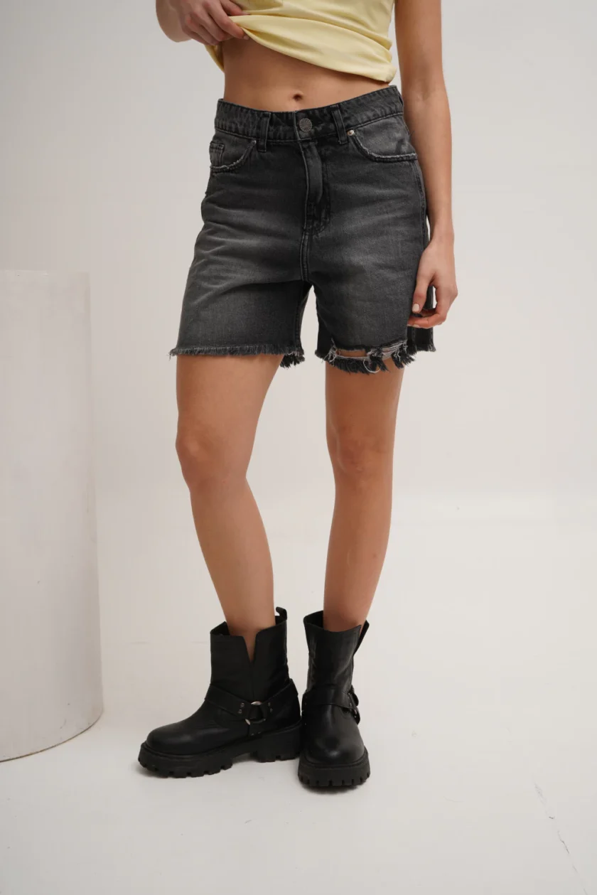 Bermuda suelta, tiro alto, con ruedo desflecado y roturas y recortes en los laterales.