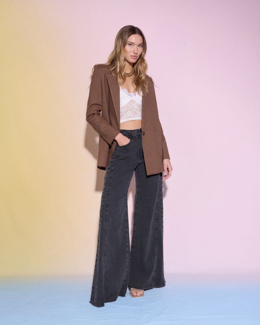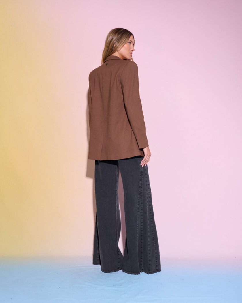 Blazer confeccionado en lino sastrero, con cuello y solapa clásica, mangas largas y hombreras. Presenta bolsillos plaqué en el delantero y acceso mediante cruce simple con botón a tono. Los puños cuentan con tajos como detalle distintivo. Íntegramente forrado.
