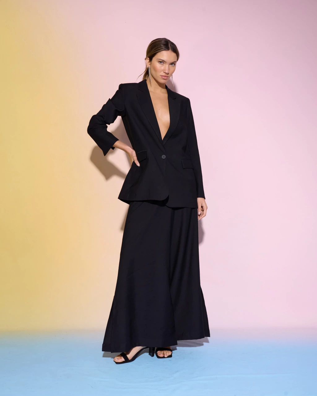 Blazer confeccionado en creppe twill con cuello y solapa clásica. Presenta hombreras que estructuran la silueta, bolsillos ojal con tapa y cruce simple con botón a tono. Los tajos en puños y la abertura en la espalda aportan un acabado prolijo y elegante. Íntegramente forrado.