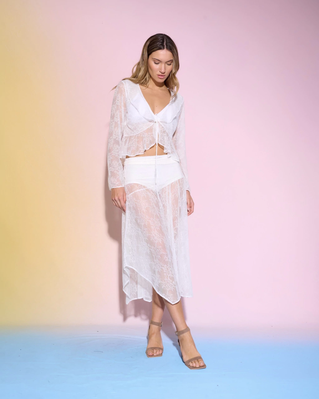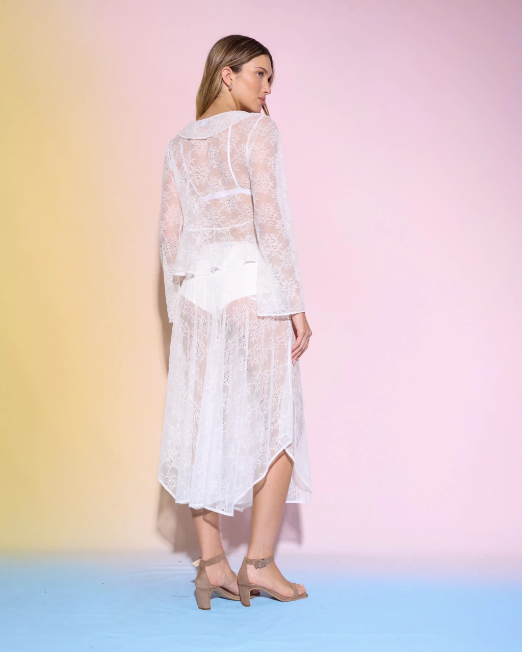 Blusa confeccionada en encaje con mangas largas de corte semi oxford. Presenta volados en todo el recorrido del cuello y el ruedo, y se ajusta con delicados lazos para atar en el centro.