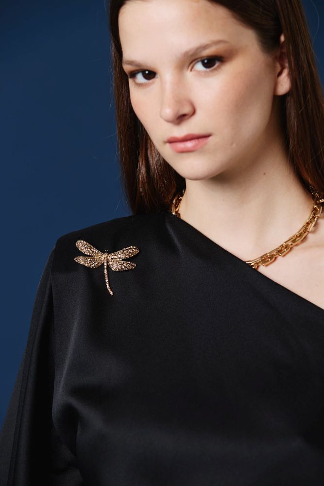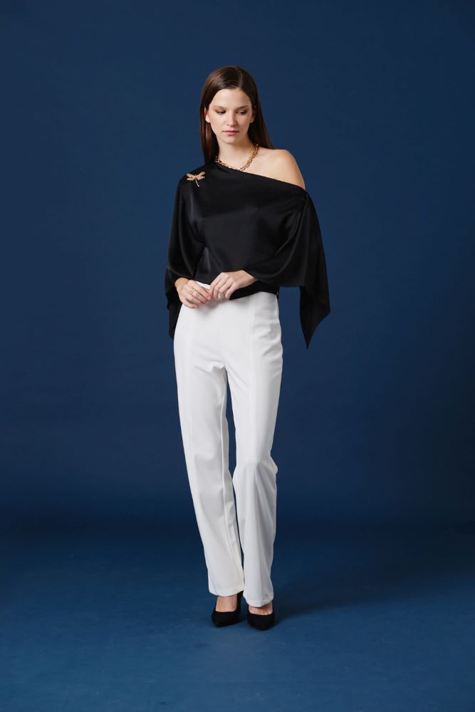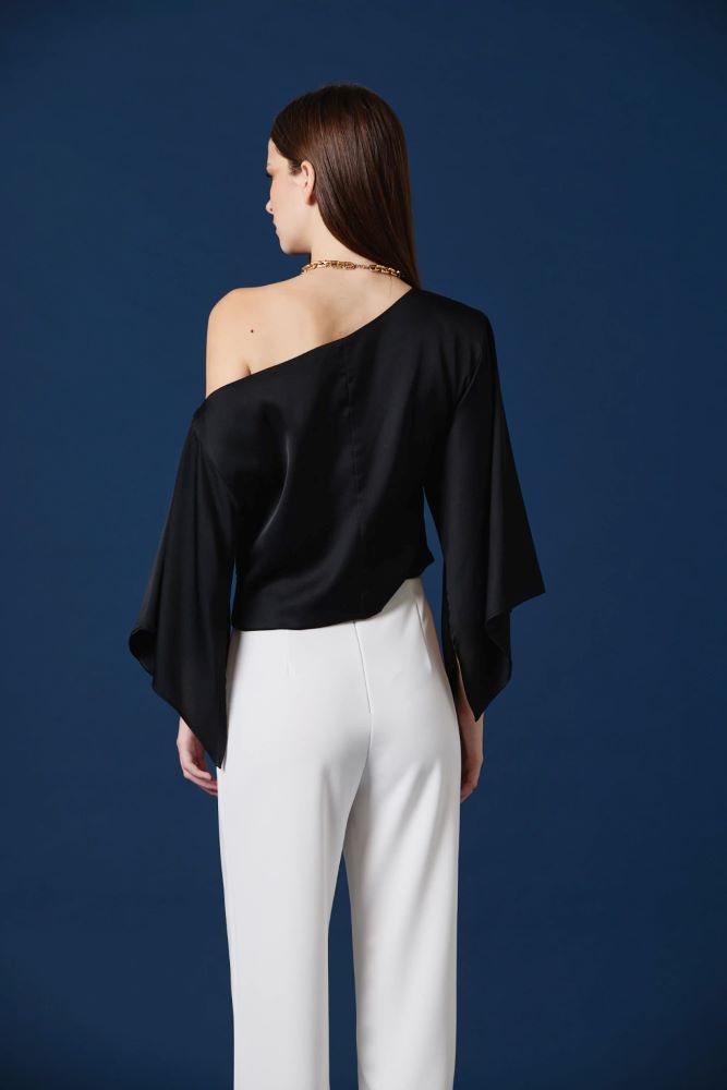 Esta blusa asimétrica de satén eleva el look con un gesto moderno y elegante que no pasa desapercibido. Su escote irregular deja un hombro al descubierto, aportando sofisticación y un aire contemporáneo, mientras que la manga amplia y la caída fluida del tejido generan movimiento y ligereza. Una prenda versátil, ideal para sumar impacto sin esfuerzo.
