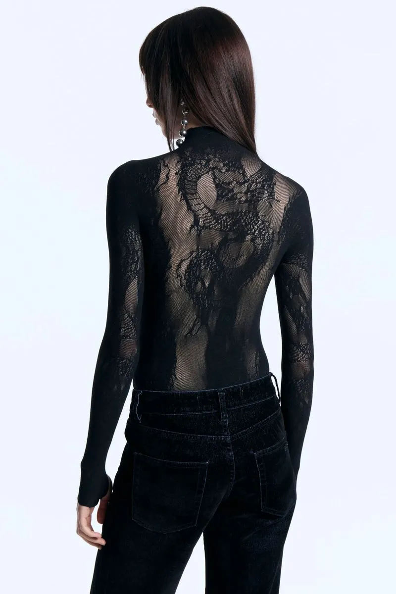 Body tejido en jacquard personalizado con dragones y logo Ginebra. Tejido hiper elastizado adaptable a todos los talles. Cuello polera adherente. Mangas largas con detalle en puños con efecto guante. Ideal para combinar con pantalones de cuero, de denim o de gabardina. Pensado para usar con segundas pieles como camisas o sweaters dejando sobresalir los puños y el cuello polera