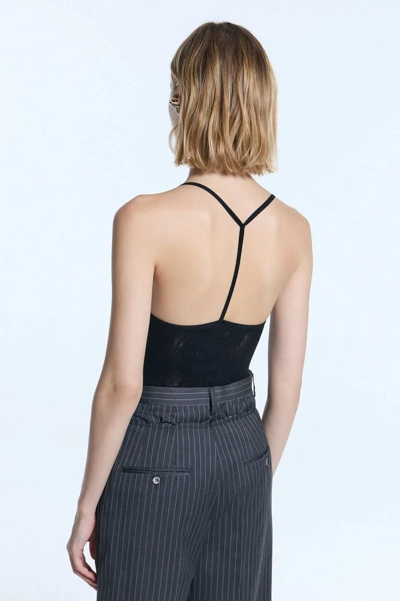 Body tejido en jacquard personalizado con dragones y logo Ginebra. Escote musculosa con detalle en espalda. Calce adherente. Ideal para combinar con pantalones marrones en cuero o gabardina para crear la paleta de la temporada.