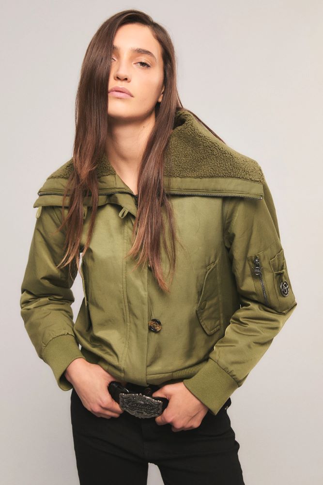 La bomber Combat Flight tiene calce regular y largo a la cintura. Presenta cuello amplio con piel sintética, cierre frontal con avíos personalizados de la marca y solapa con botones. Cuenta con bolsillos laterales, puños y cintura de rib. Un bolsillo con cierre en la manga completa su estilo utilitario y moderno. Inés está usando en la prenda superior un talle S, y en la prenda inferior un talle S/26. Sus medidas son: Altura 1.75 m. Busto 75 cm. Cintura 65cm. Cadera 90cm.