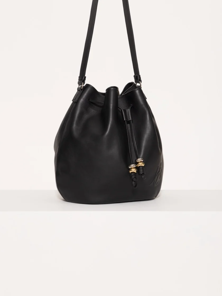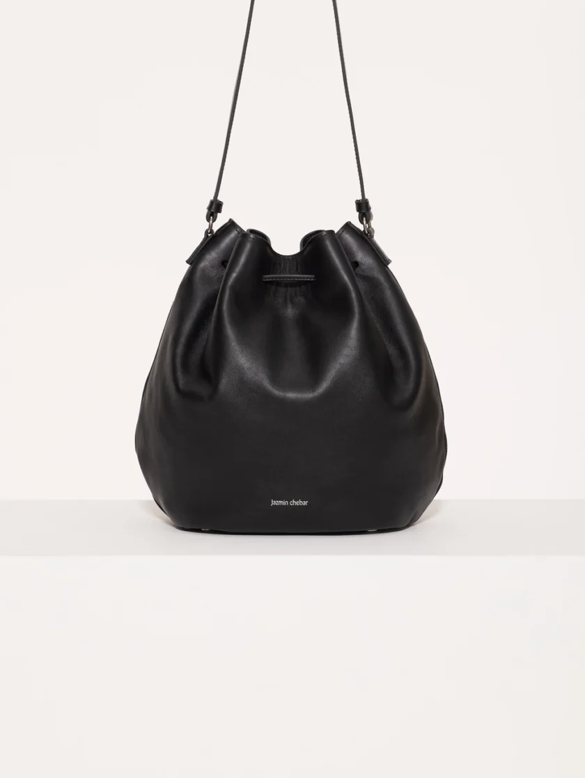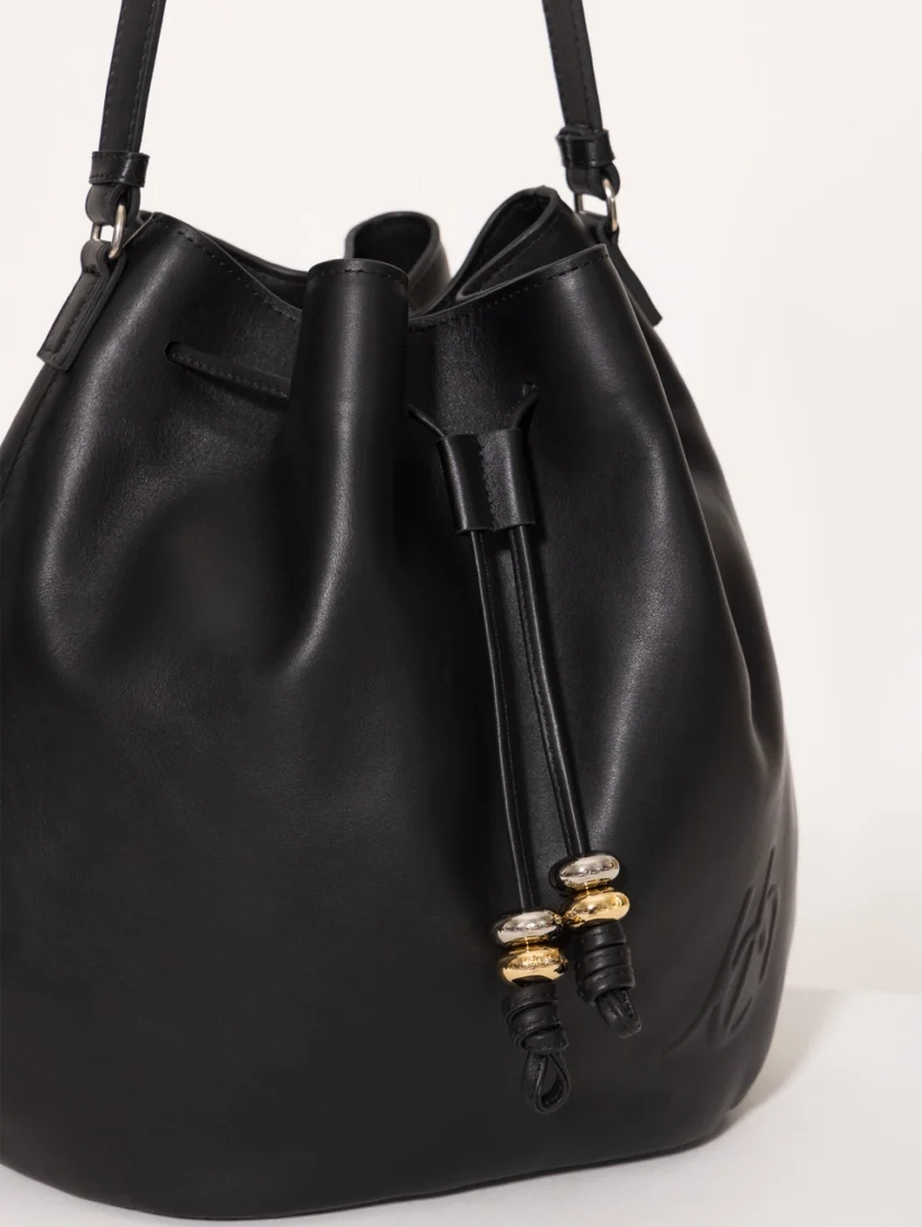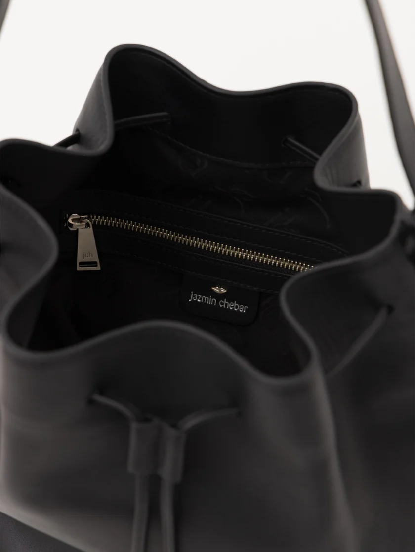 Bucket Follow confeccionado en gamuza, con ajuste mediante tientos de cuero con terminales metálicas. Lleva logo en relieve en el frente y bolsillo interior con cierre. Un diseño moderno y funcional con textura sofisticada.