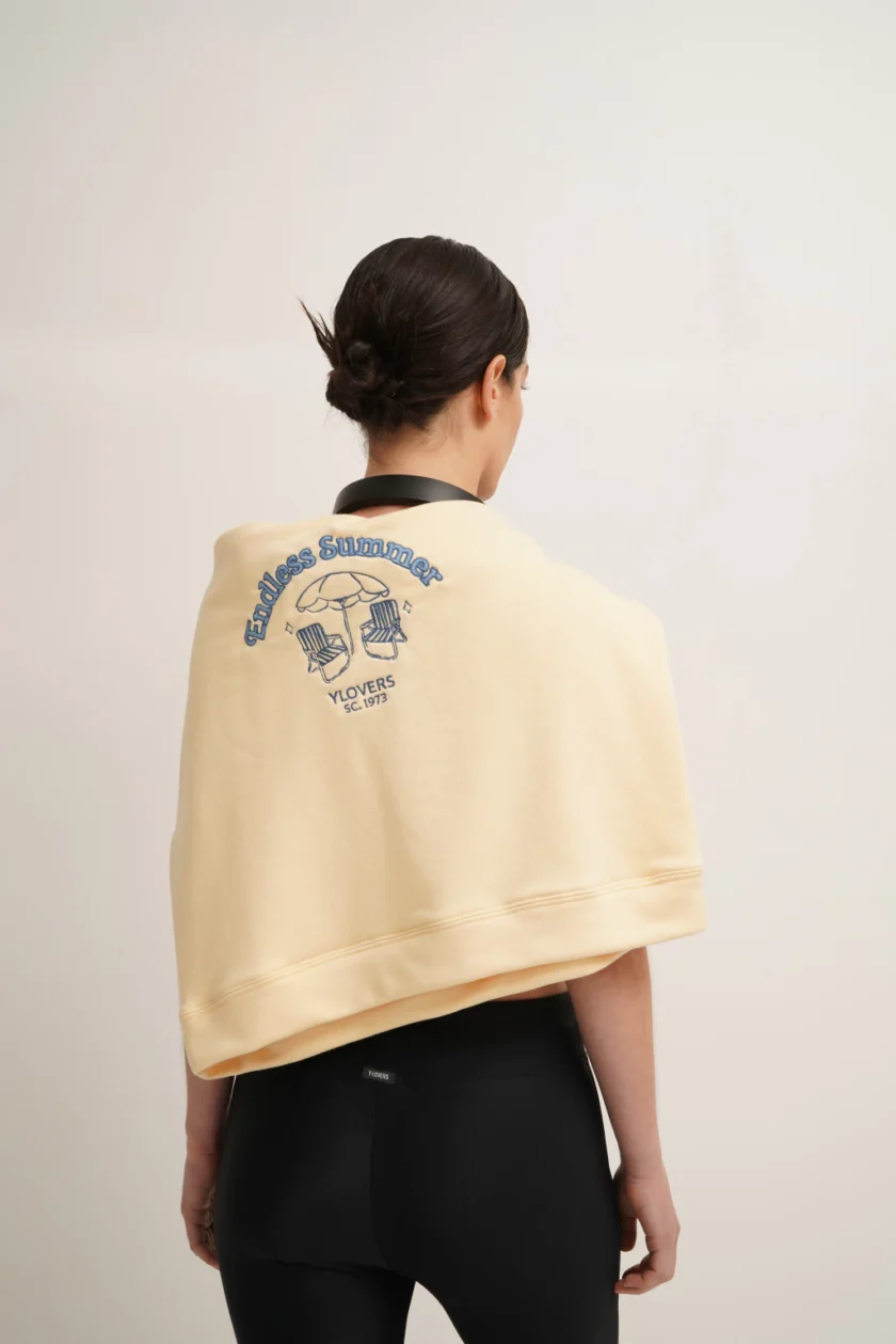 Buzo oversized, largo hasta el inicio de la cadera, con cuello redondo, sin capucha y puños y cuello de ribb a tono.