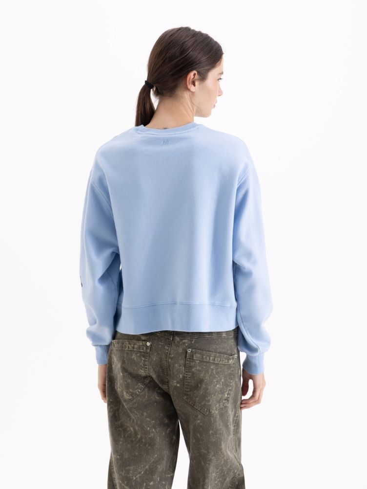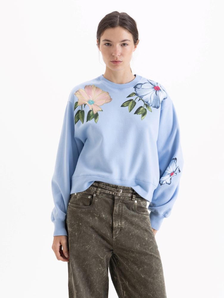 Buzo Lirio de fit oversize y largo a la cadera, con cuello redondo a la base. Presenta estampa en el delantero.