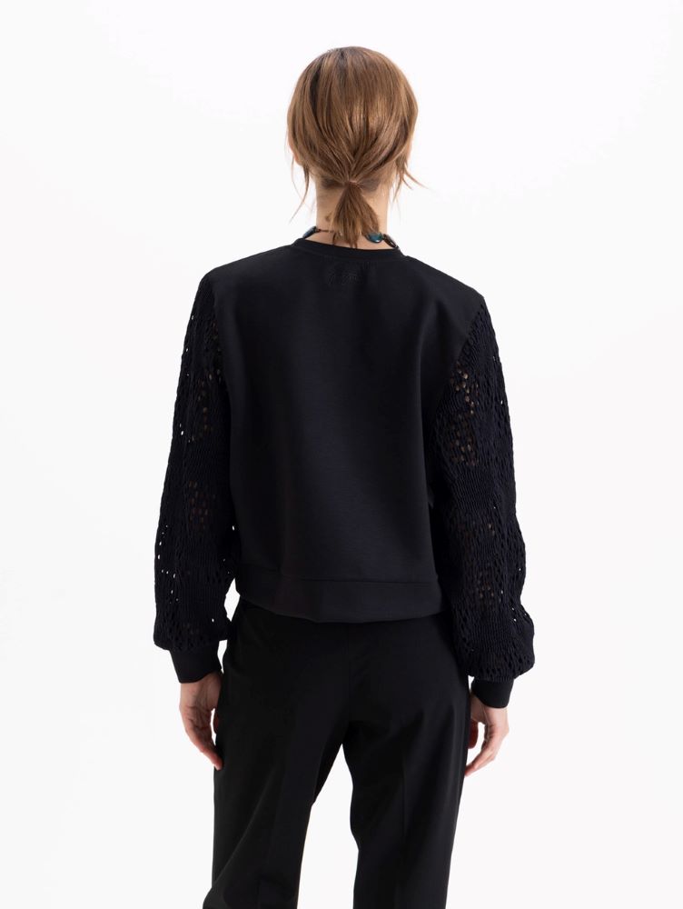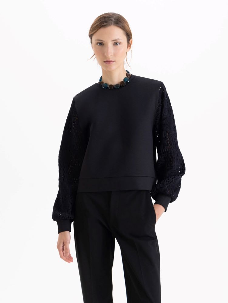 Buzo Maddie confeccionado en tela de punto lisa combinado con mangas en tejido calado que aportan textura y contraste. Lleva escote redondo y mangas largas. De calce regular, es una prenda cómoda con un detalle diferencial en las mangas.