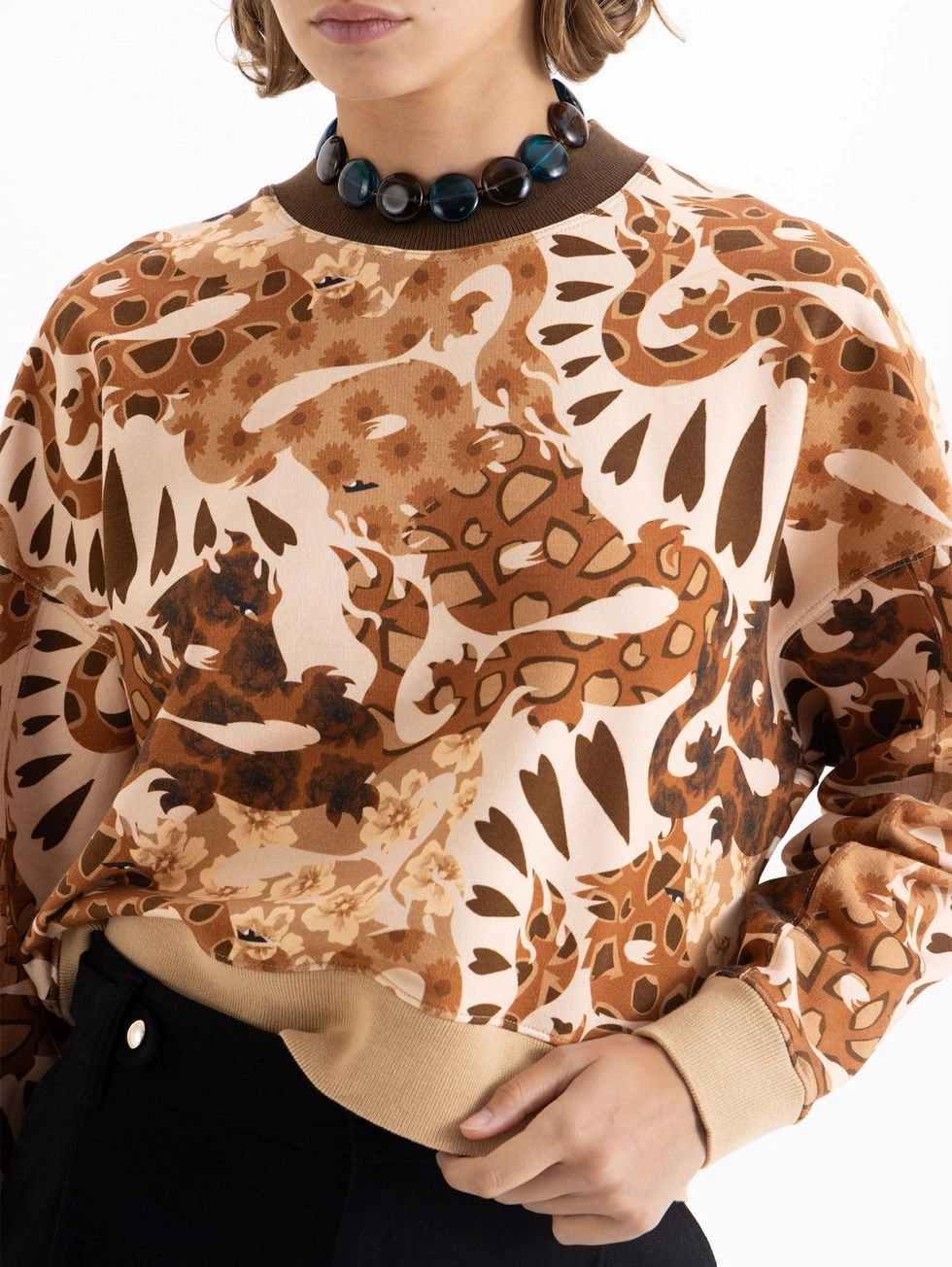 Buzo Safari confeccionado en rústico con estampa full print. Lleva cuello tejido en color chocolate y puños y cintura tejidos en beige, combinando con los tonos de la estampa. Presenta escote redondo y mangas largas. De calce amplio, es ideal para un look relajado.
