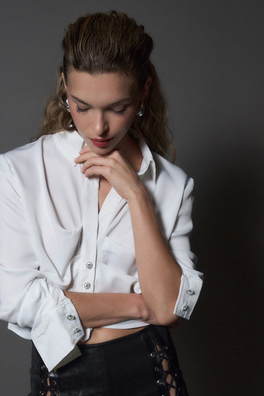 La camisa Asher está confeccionada en satén con leve elasticidad. Tiene largo crop y una silueta relajada que aporta un toque moderno y sofisticado. Viene en dos variantes de color: blanco y negro. Esta prenda se distingue por su elegante detalle de entrelazamiento en el delantero. Los botones de cristal fijos complementan su diseño refinado. Con su corte único, esta camisa realza la figura y te permite destacarte con estilo y elegancia en cualquier ocasión. Ideal para quienes buscan una pieza sofisticada que combine con cualquier look.