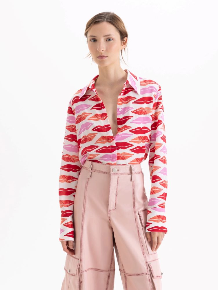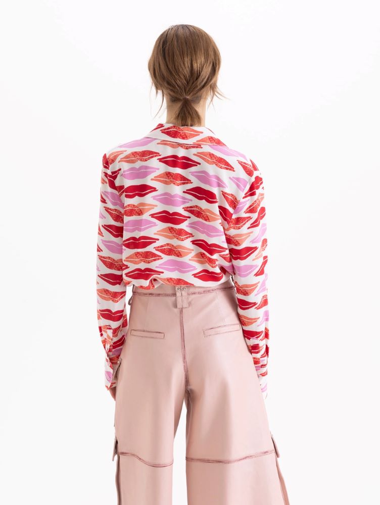 Camisa Boquitas confeccionada en seda con estampa en frente, espalda y mangas. De largo hasta la cadera, presenta cartera escondida con botones al tono. El primer botón y los botones de puño vienen en color rosa como detalle distintivo.