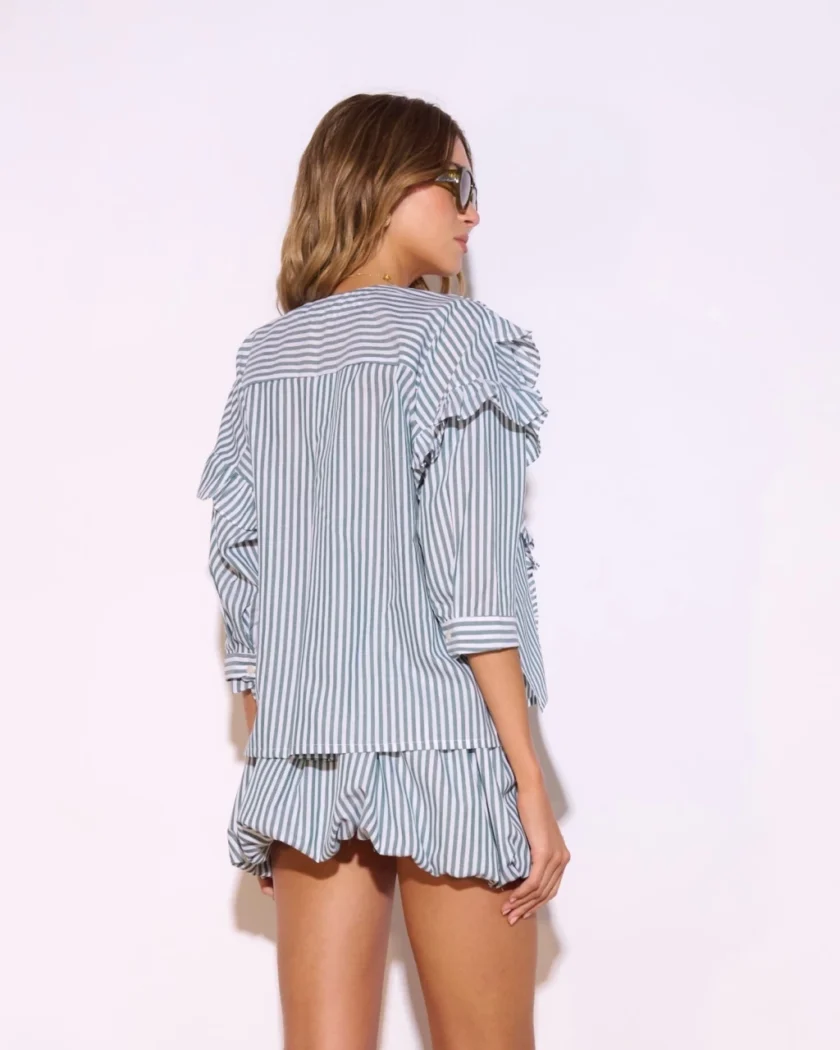 Camisa rayada con escote en V y mangas 3/4, realzada con volados en hombros, mangas y delantero. Presenta cartera con botones personalizados y espalda con canesú y tablón.