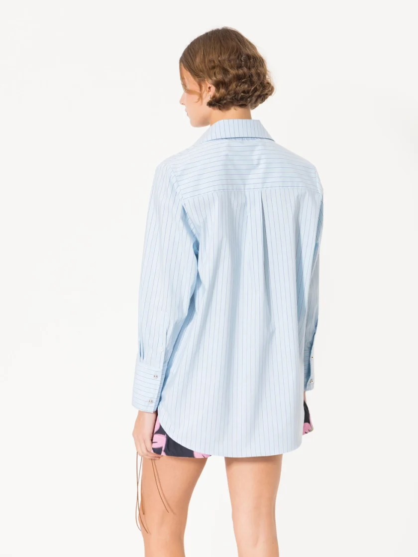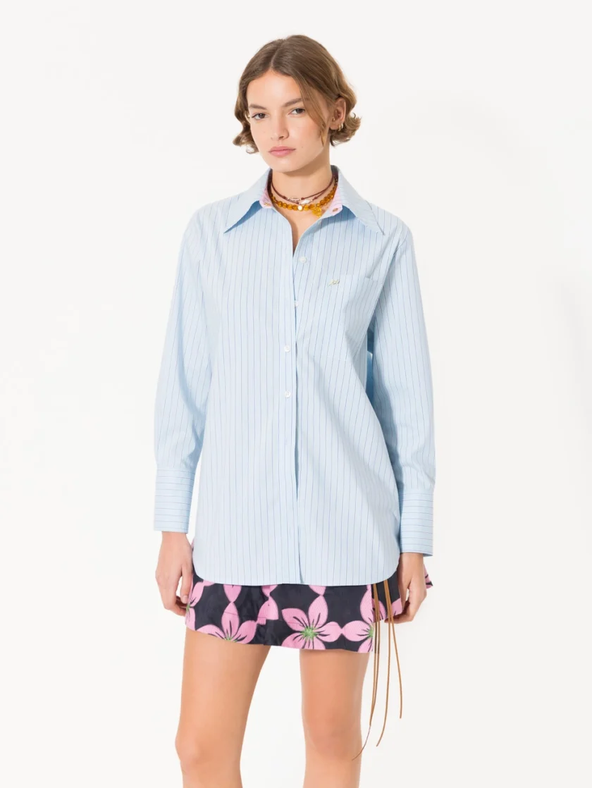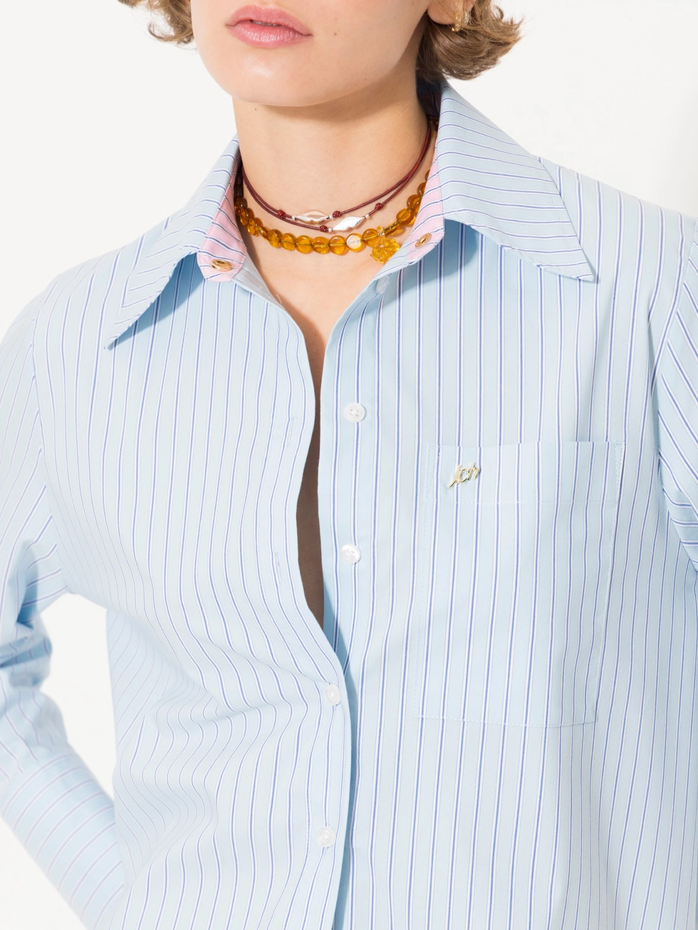 Camisa Champ con fit holgado, confeccionado en poplin rayado. El pie de cuello interior lleva tela a contratono. Su acceso es mediante botones Jch y broches mini bolita en pie de cuello y puños. Lleva un bolsillo plaqué en delantero y en pie de cuello tiene un remache Jch mini en oro rosa.