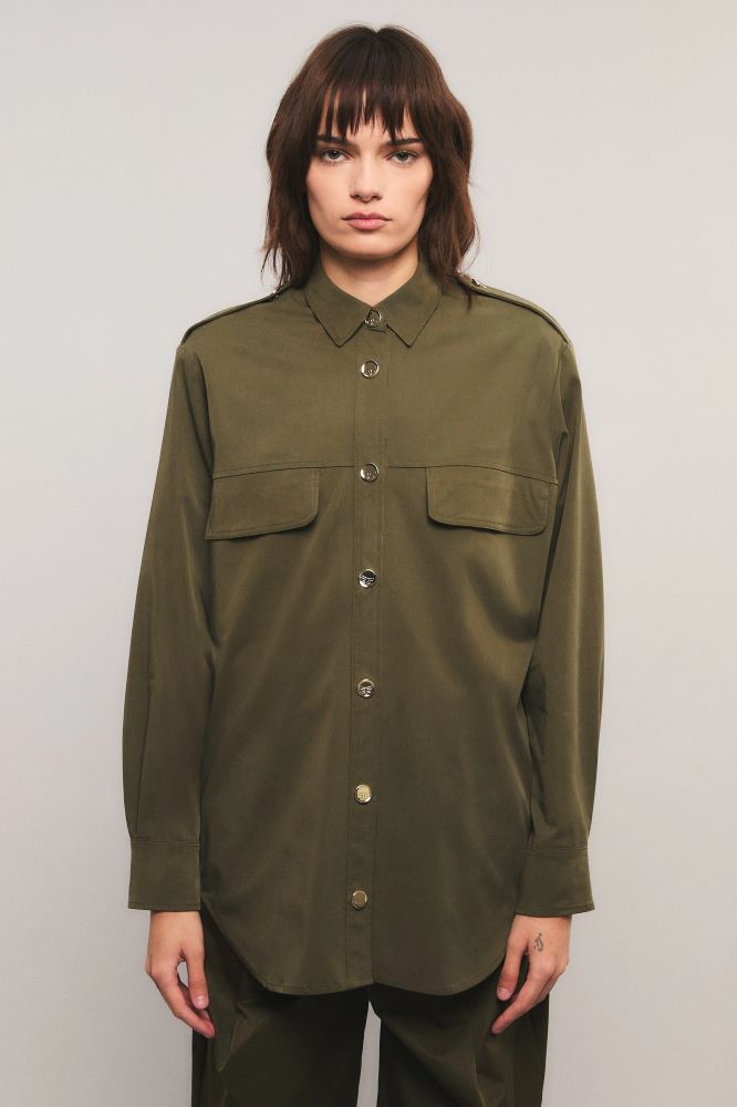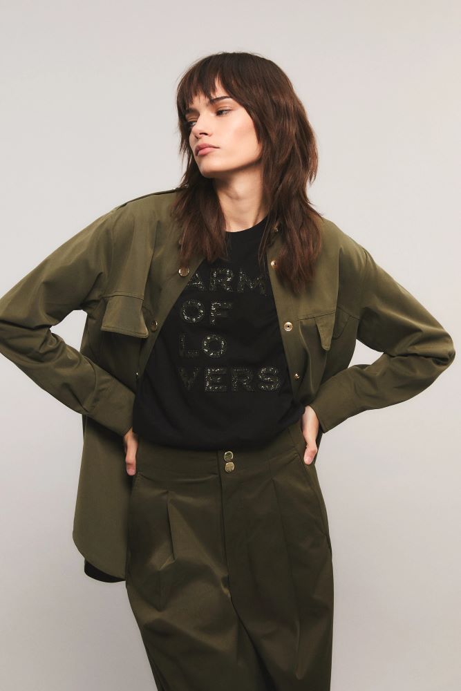 La camisa Combat Glam, de calce regular, está confeccionada en tejido suave al tacto. Posee canesú delantero y en espalda, y bolsillos con solapas. Su cerramiento es mediante broches dorados con el logo de la marca. Miranda está usando en la prenda superior un talle S, y en la prenda inferior un talle S/26. Sus medidas son: Altura 1.73 m. Busto 77 cm. Cintura 59cm. Cadera 85cm.