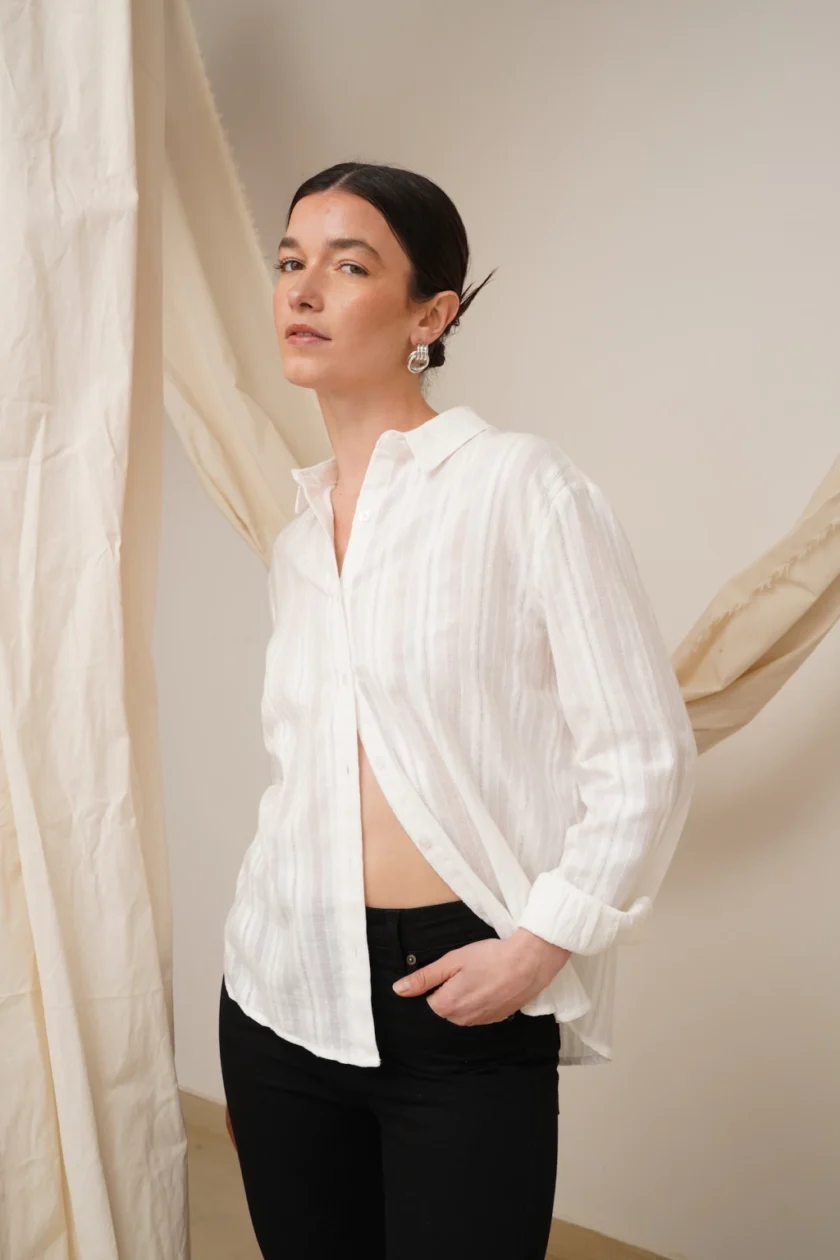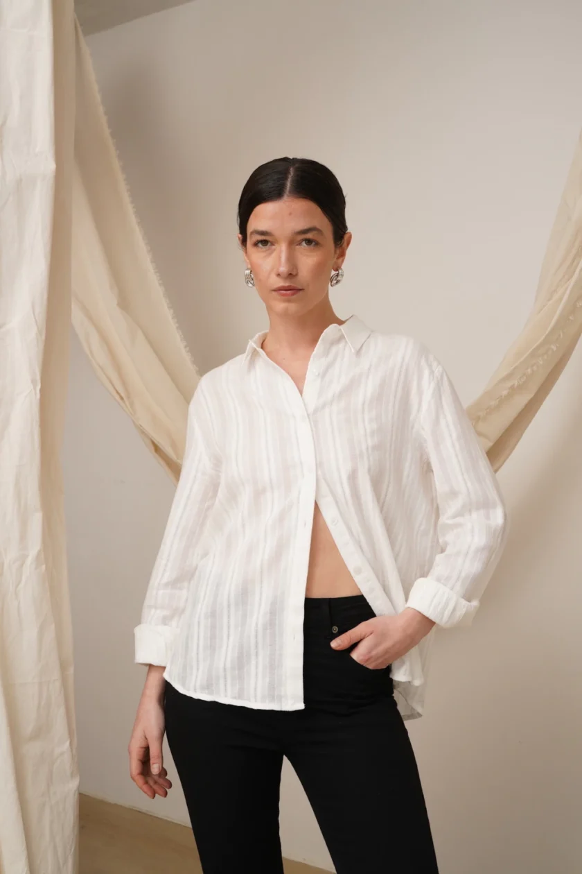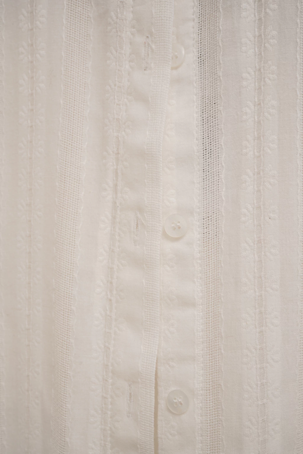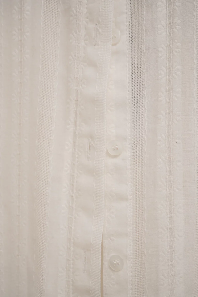 Camisa de fit oversized, con frunce en los puños y cartera central en el frente. Confeccionada en rattier de algodón con diseño de flores y calado.