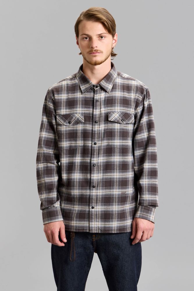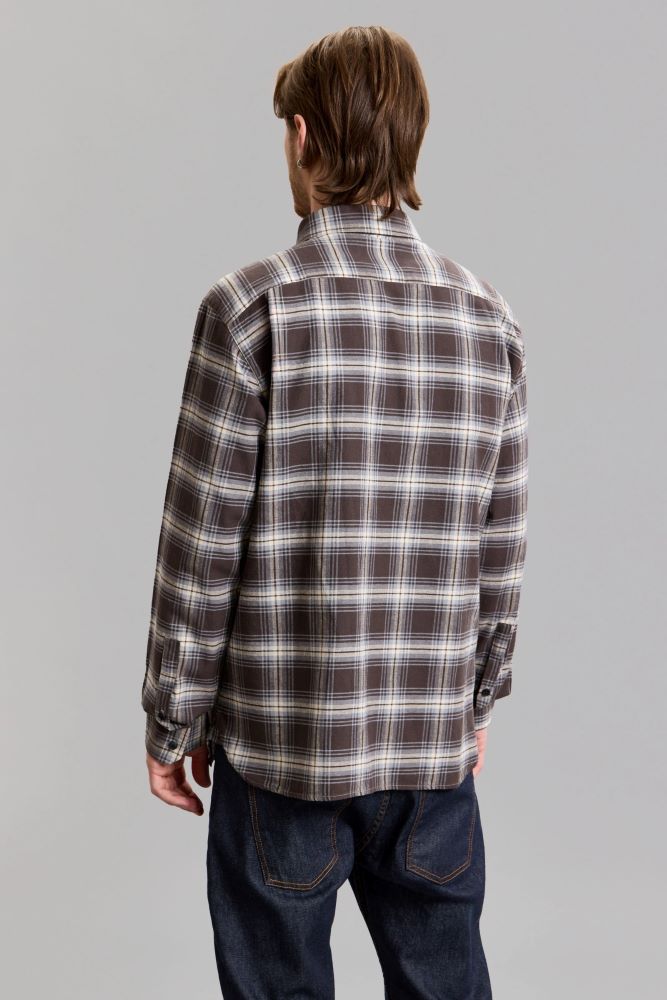 La camisa garage HCG tiene un calce regular, bolsillos con tapa y avios marcarios. Está confeccionada en viyela 100% algodón. Luigi está usando en la prenda superior un talle M, y en la prenda inferior un talle S/30. Su altura es de 1.78 m.