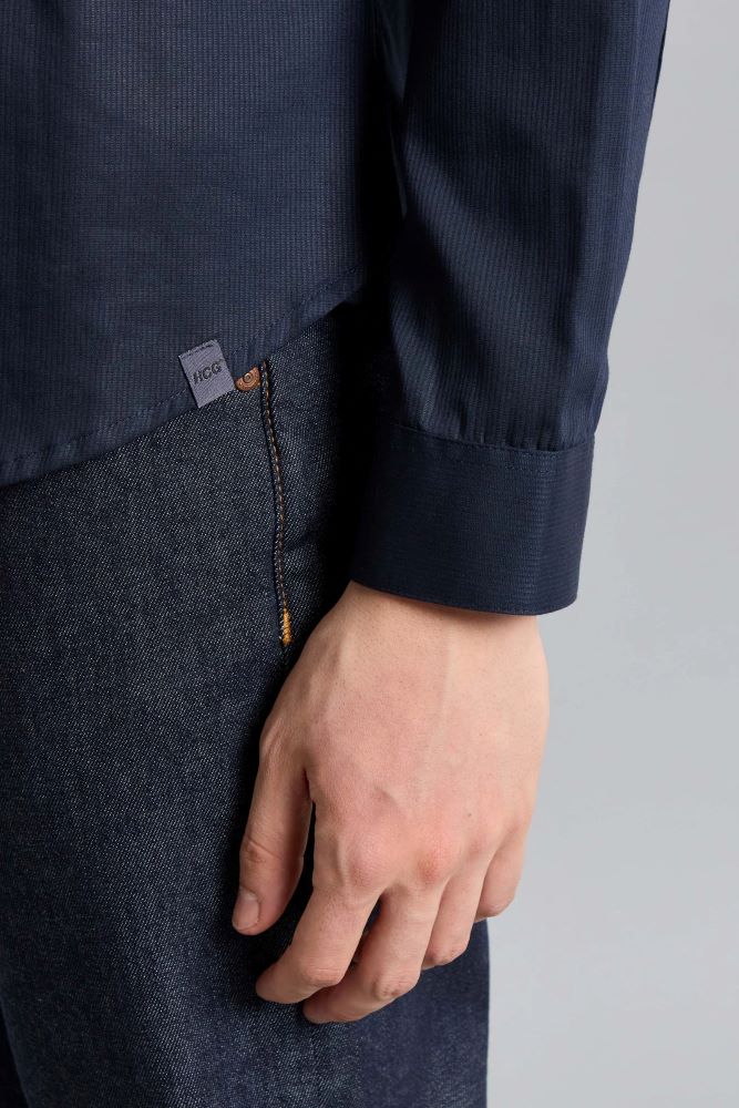 La camisa north dark tiene un calce slim con cuello tipo italiano y manga larga. Está confeccionada en ratier 100% algodón y posee avios marcarios. Nacho está usando en la prenda superior un talle M, y en la prenda inferior un talle S/30. Su altura es de 1.85 m.
