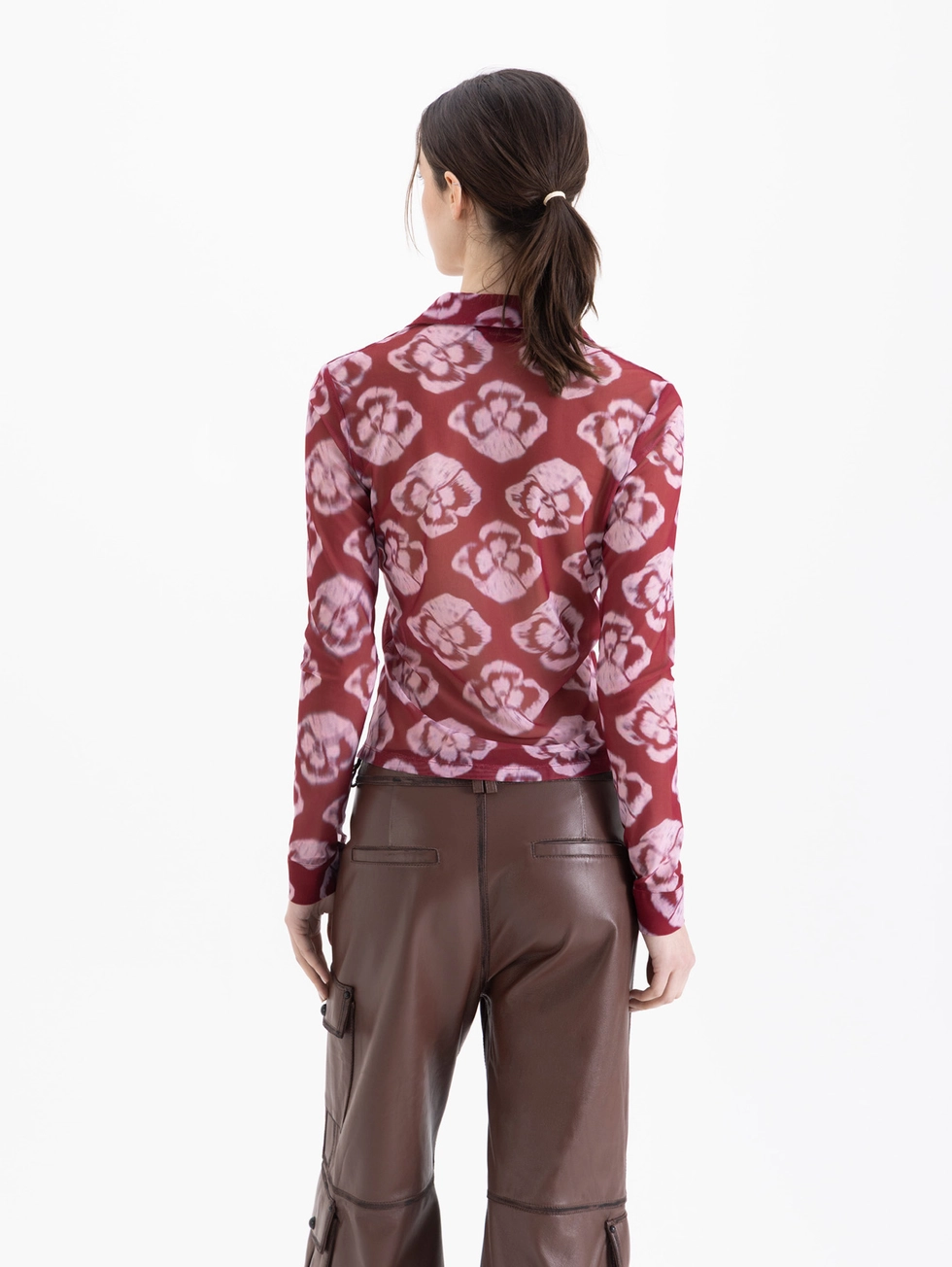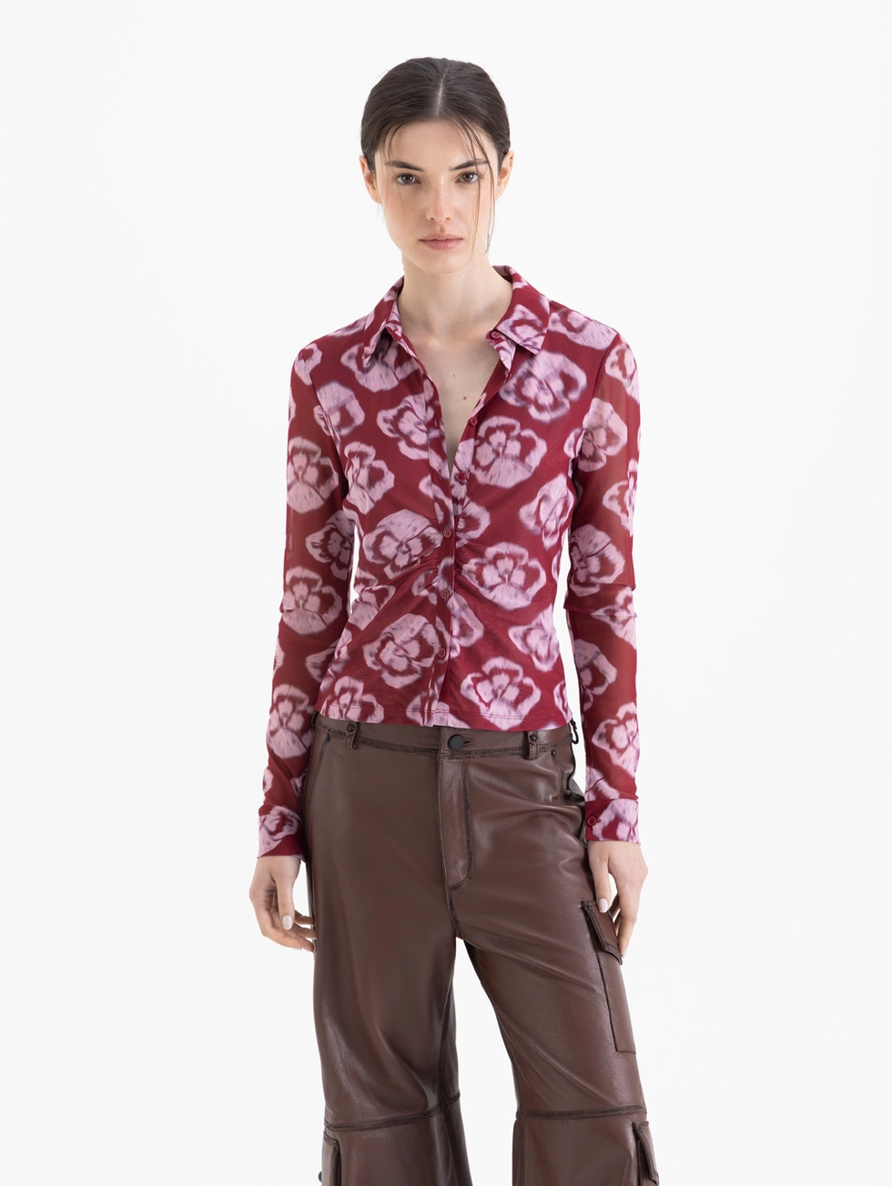 Camisa Paris confeccionada en mesh, con estampa full print y de mangas largas. Lleva drapeado en centro delantero. Su largo es a la altura de la primera cadera.