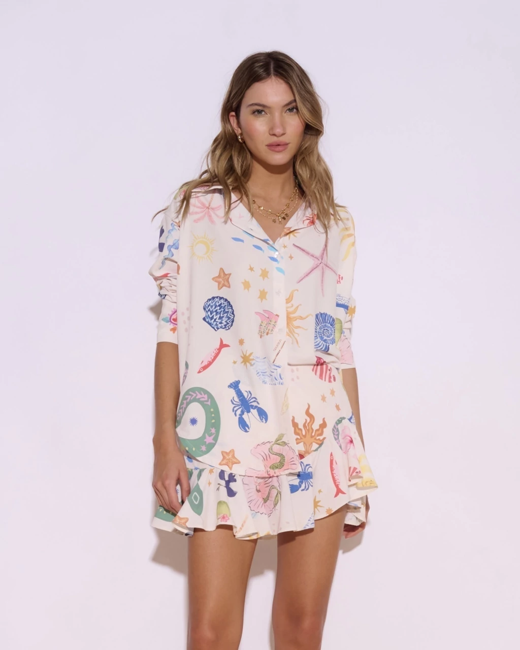 Camisa clásica de manga larga con estampa exclusiva desarrollada por Shibinda. Presenta cartera frontal con botones personalizados y canesú en la espalda que aporta mejor estructura y caída.