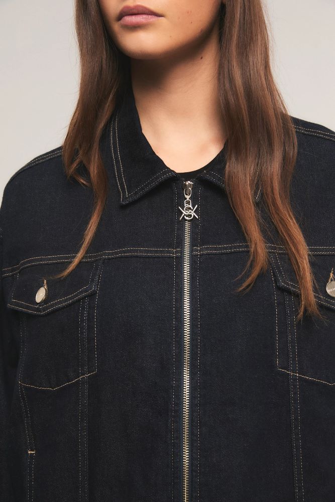 La Campera Break Premium Blue es de calce regular y combina denim con lavado artesanal en tono Deep Blue, que aporta suavidad y textura, junto a un tejido memory verde. Presenta puños y cintura elastizados en ribb, cierre frontal con el logo insignia de la marca y tres bolsillos funcionales: dos delanteros y uno en la manga con cierre. Inés está usando en la prenda superior un talle S, y en la prenda inferior un talle S/26. Sus medidas son: Altura 1. 75 m. Busto 75 cm. Cintura 65cm. Cadera 90cm.