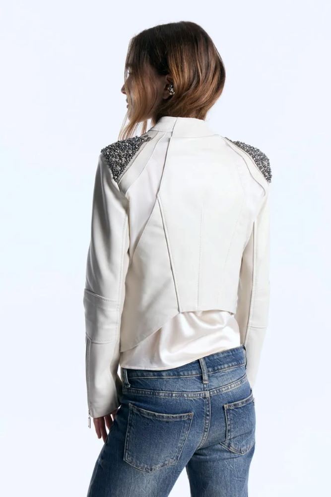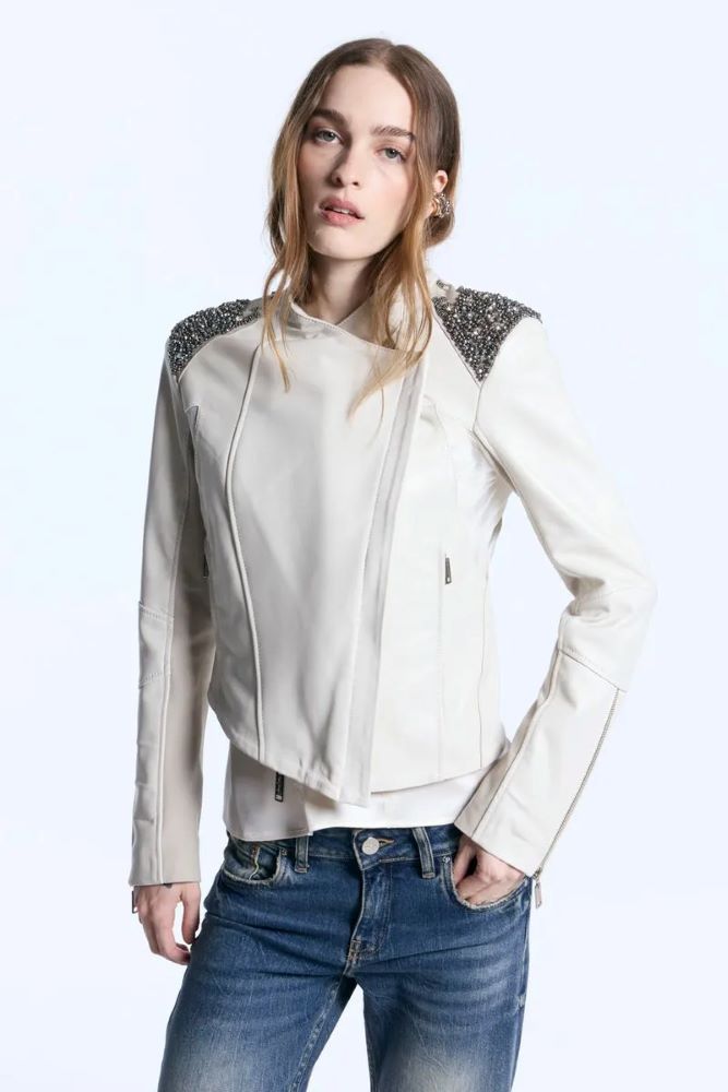 Campera confeccionada en cuero 100%. Con corte entallado, presenta recortes geométricos combinados en microtul y ribb, aplicados tanto en el delantero como en la espalda. Incorpora piedras aplicadas en los hombros que aportan brillo. El acceso frontal es mediante cierre metálico con tiracierre, mientras que los puños cuentan con cierres metálicos.
