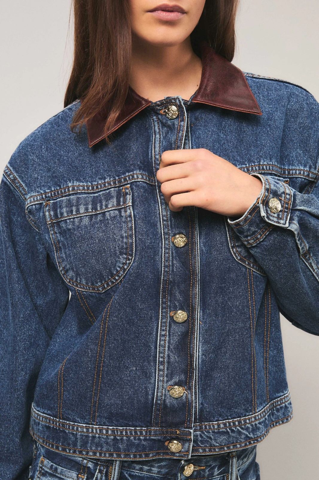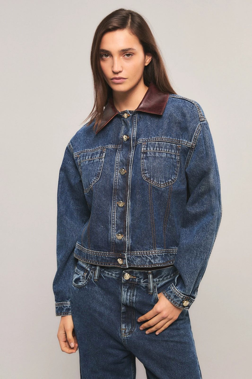 La Campera Florence presenta un corte desenfadado y un largo corto, confeccionada en tejido 100% algodón. Su exclusivo proceso de lavado artesanal aporta un tono deep blue con delicados efectos graduales. Como detalles distintivos, incorpora un cuello de cuero en color bordo, dos bolsillos de parche laterales y botones joya dorados, diseñados especialmente para esta colección. Inés está usando en la prenda superior un talle S, y en la prenda inferior un talle S/26. Sus medidas son: Altura 1. 75 m. Busto 75 cm. Cintura 65cm. Cadera 90cm.