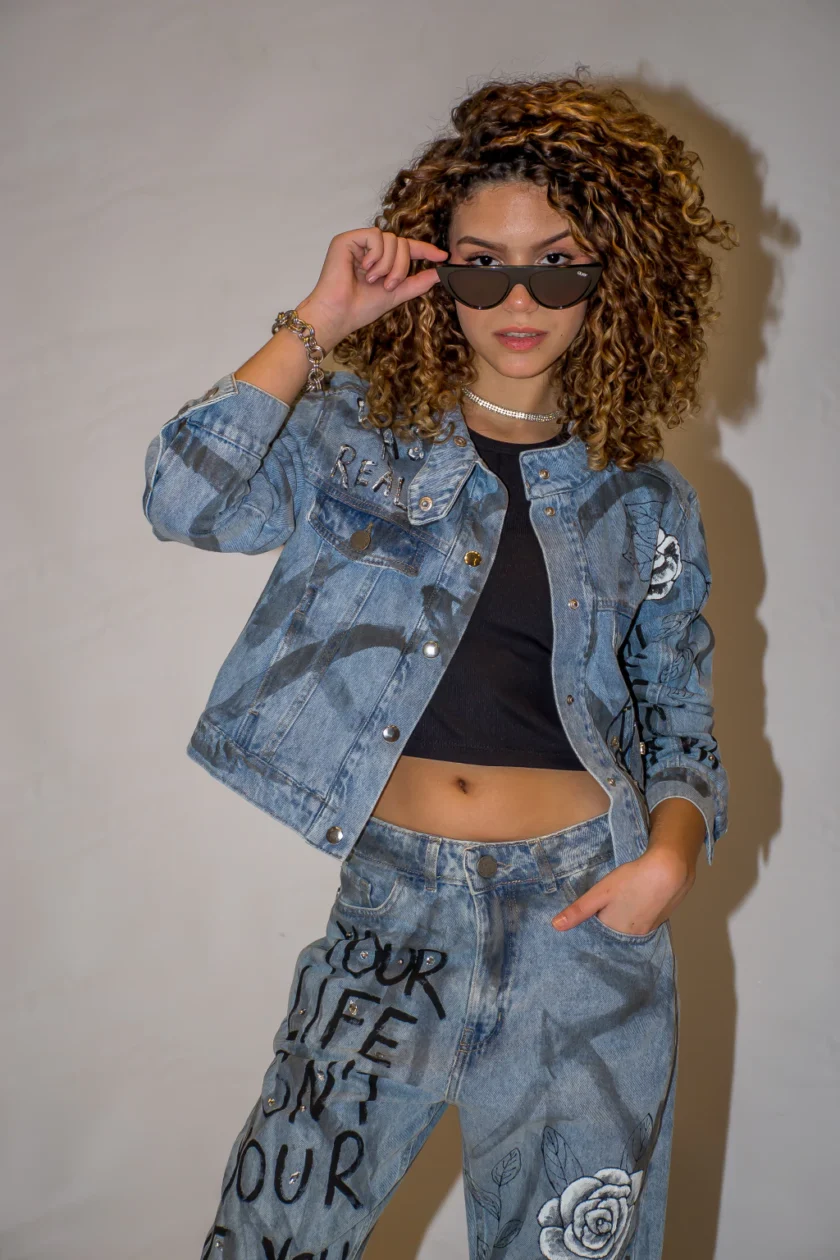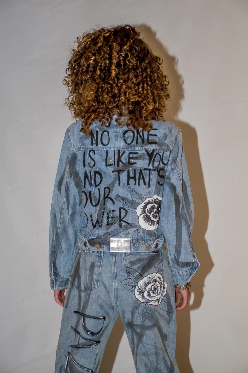 Campera de denim intervenida con ilustraciones y frases en contraste. De corte clásico con broches metálicos, es una prenda única que mezcla arte y moda para looks con mucha personalidad.