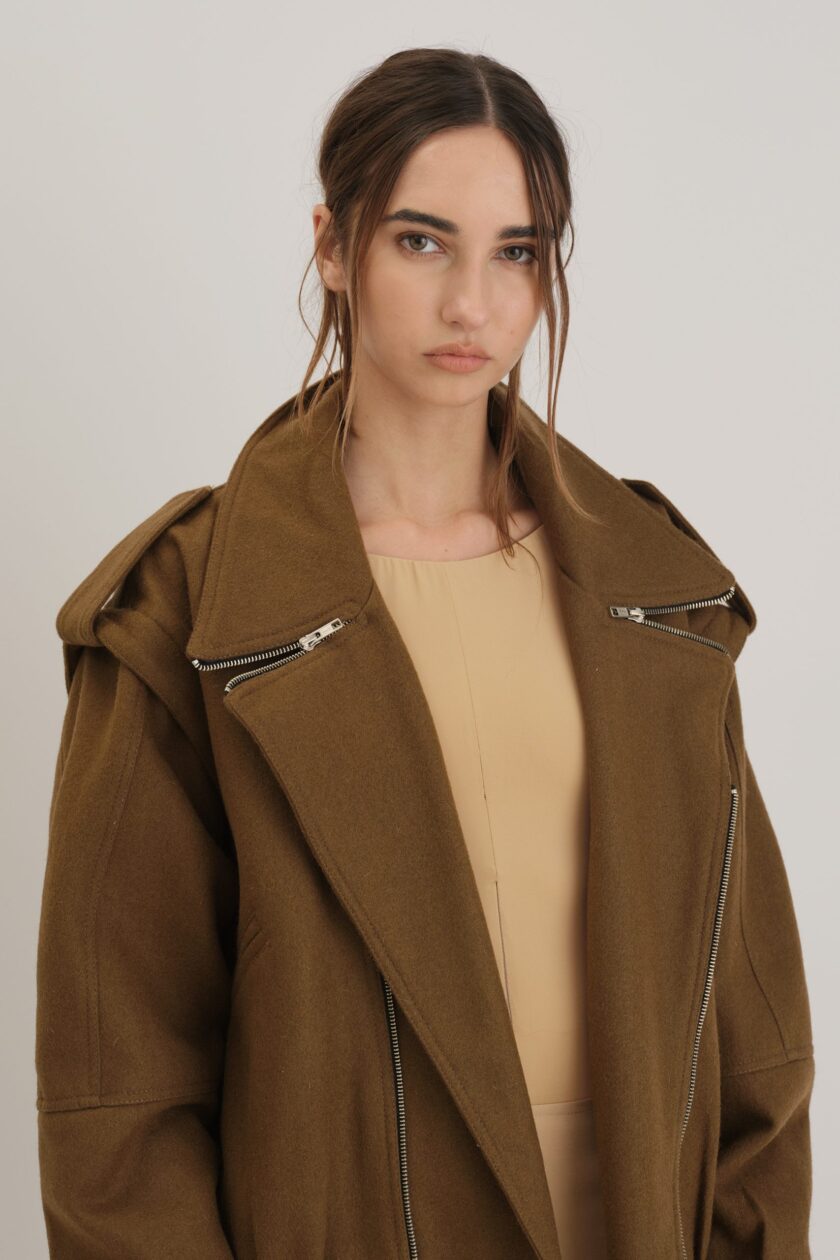 Campera oversize confeccionada en paño de lana 100%. Forrada en su interior. Contiene cartera y solapas con cierres metálicos.