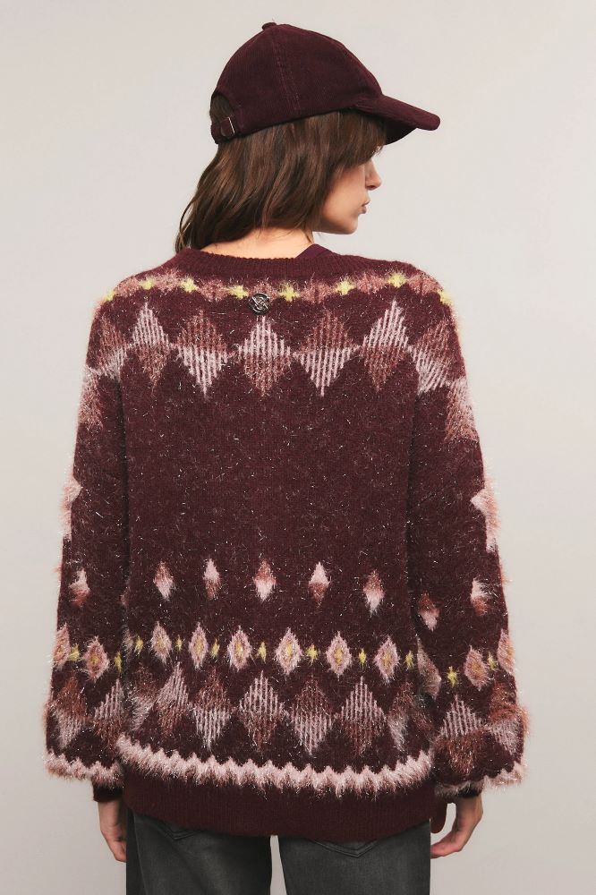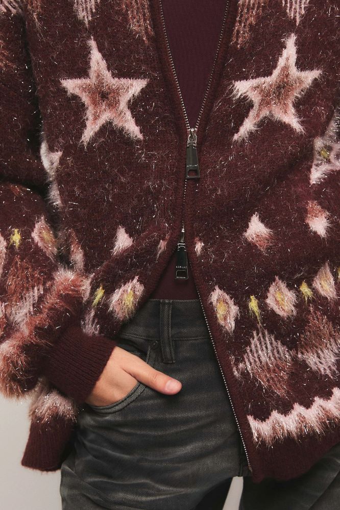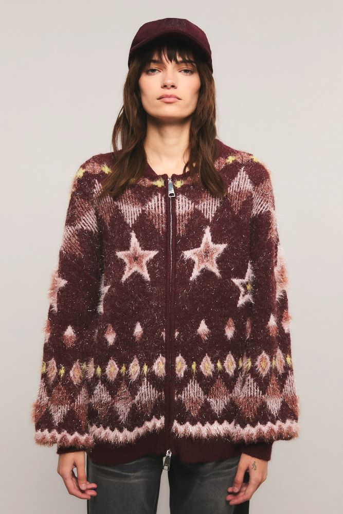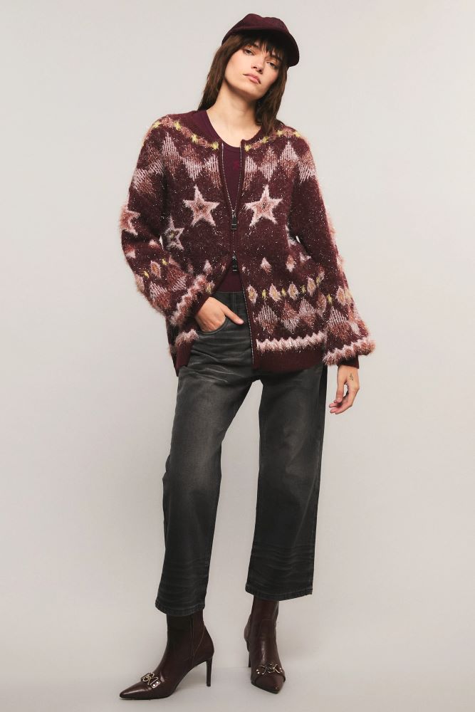 El cardigan Fang presenta un calce oversized y cierre delantero. Confeccionado en tejido jacquard con un diseño exclusivo de la colección, elaborado en hilado de lúrex texturado. Cuenta con detalles en rib. Miranda está usando en la prenda superior un talle S, y en la prenda inferior un talle S/26. Sus medidas son: Altura 1.73 m. Busto 77 cm. Cintura 59cm. Cadera 85cm.
