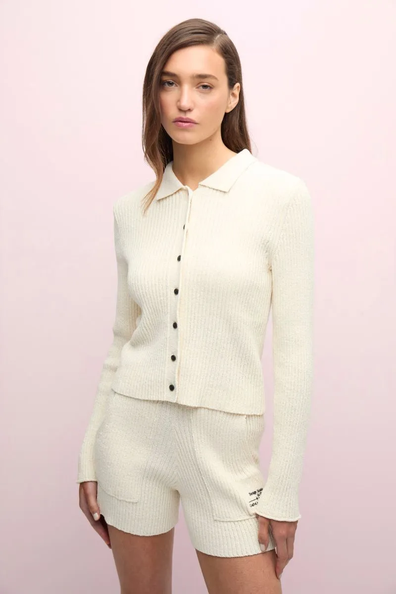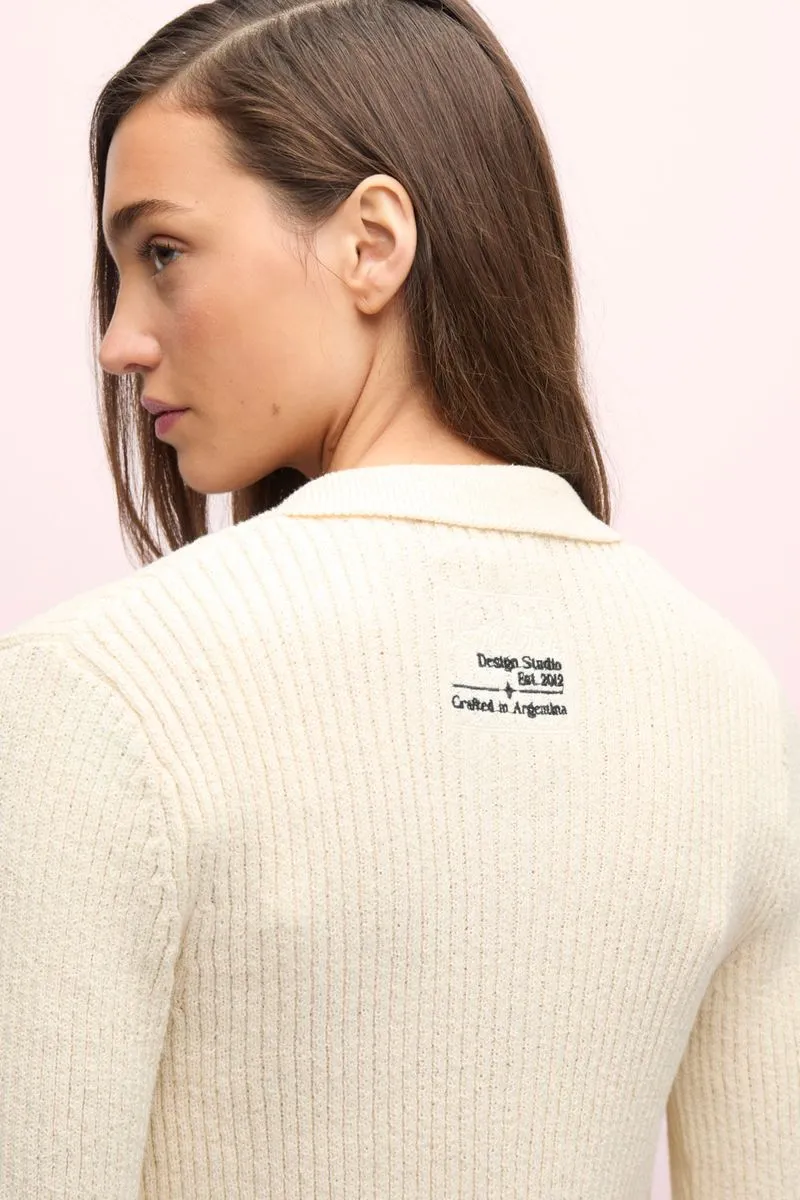 El Cardigan Margarita, de hilado de algodón, es de calce clásico, cuello tipo polo y manga larga. Lleva cartera con botones como acceso de frente y botones personalizados a contratono de prenda. Cuenta con un top en mismo hilado, con breteles regulables, para completar el twin set. Presenta un bordado en ambas prendas como distintivo. Una prenda versátil y canchera ideal para el verano.