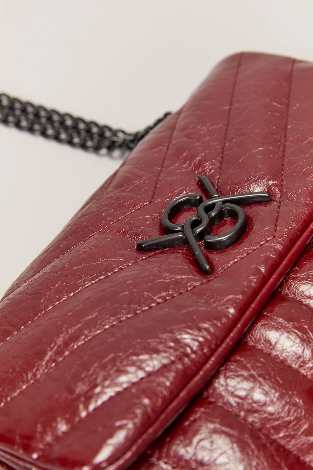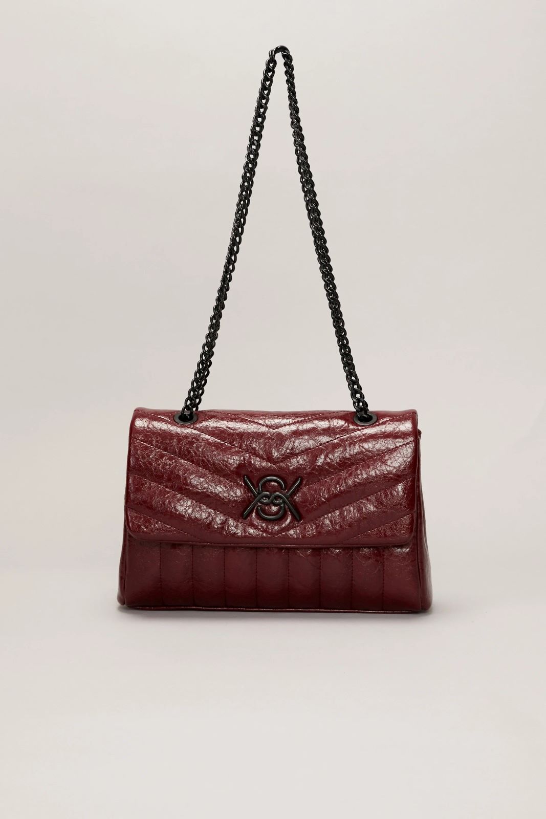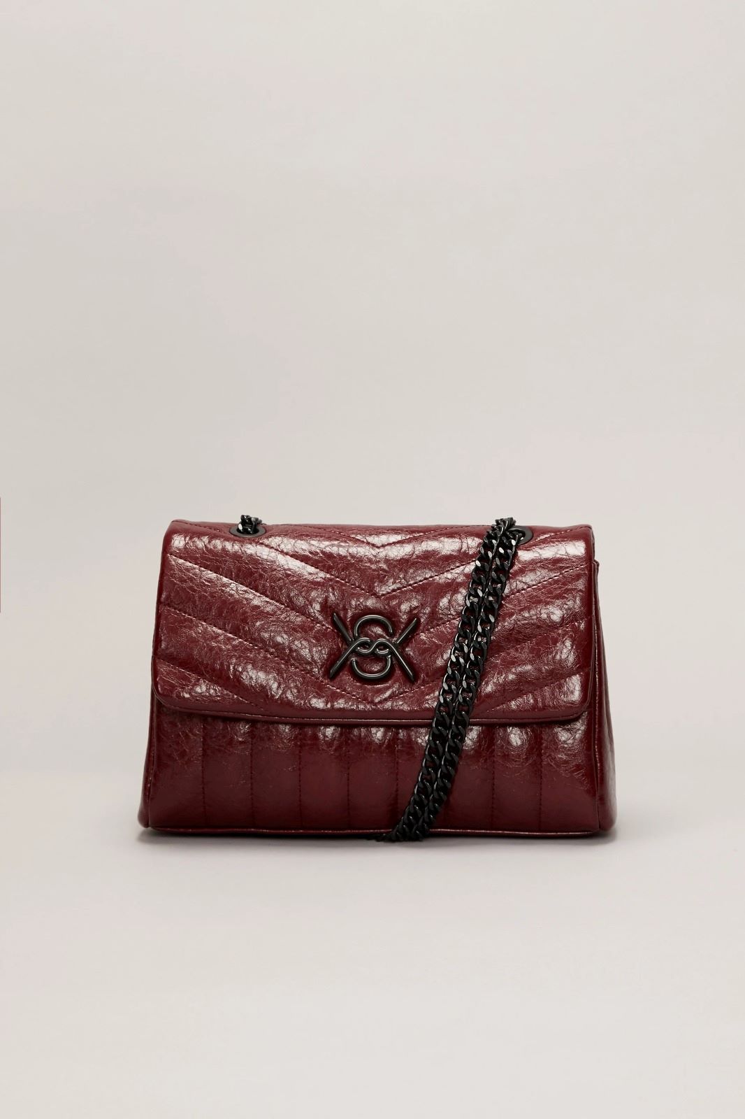 La cartera Muse está confeccionada en símil cuero texturado. Presenta el isologo de la marca aplicado al frente y una cadena metálica que permite llevarla al hombro o cruzada. Su interior está forrado y cuenta con compartimento con cierre. El acceso principal es mediante solapa con broches. Medidas: altura 18cm, ancho 27cm, profundidad 7,5cm.