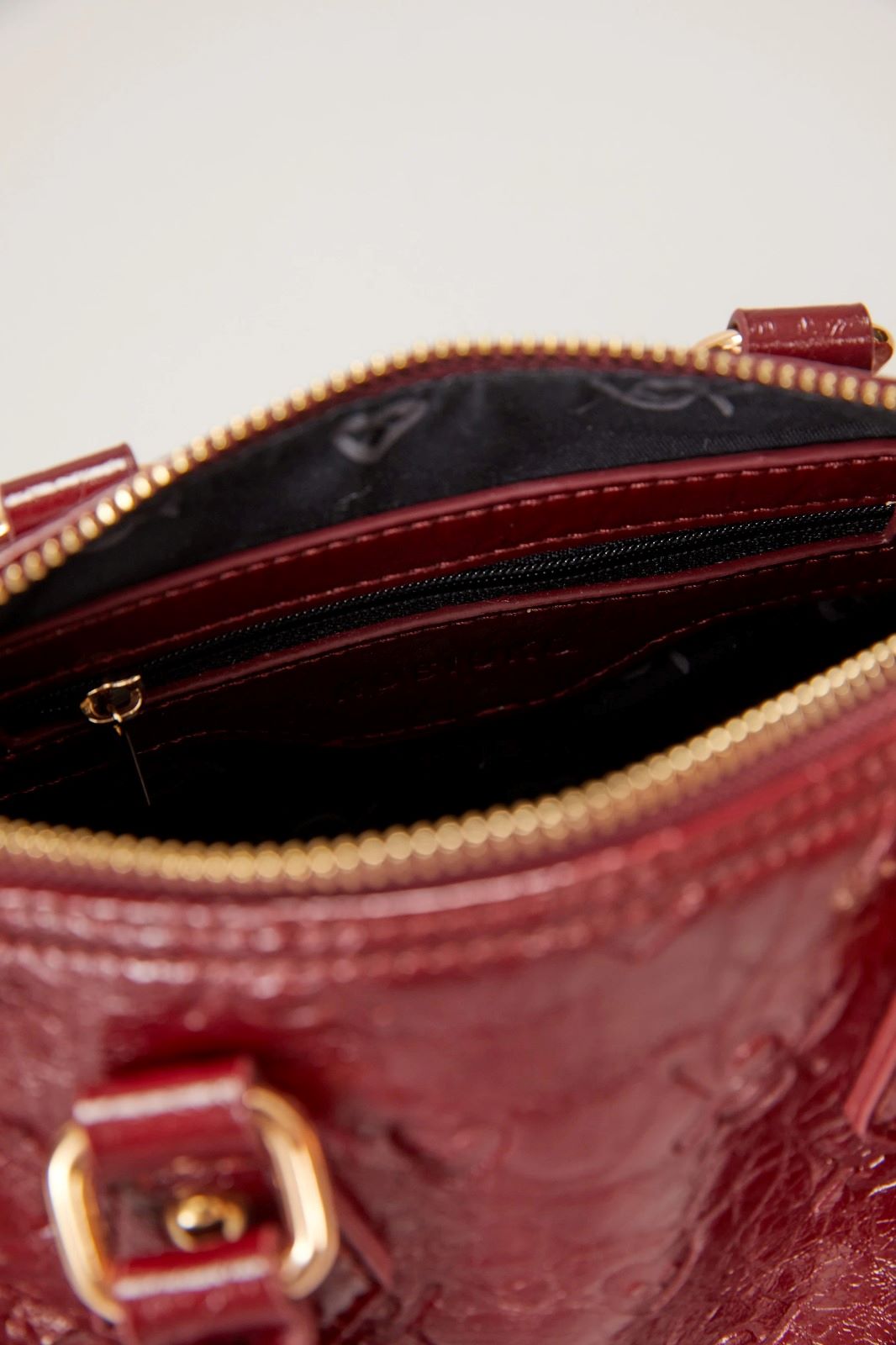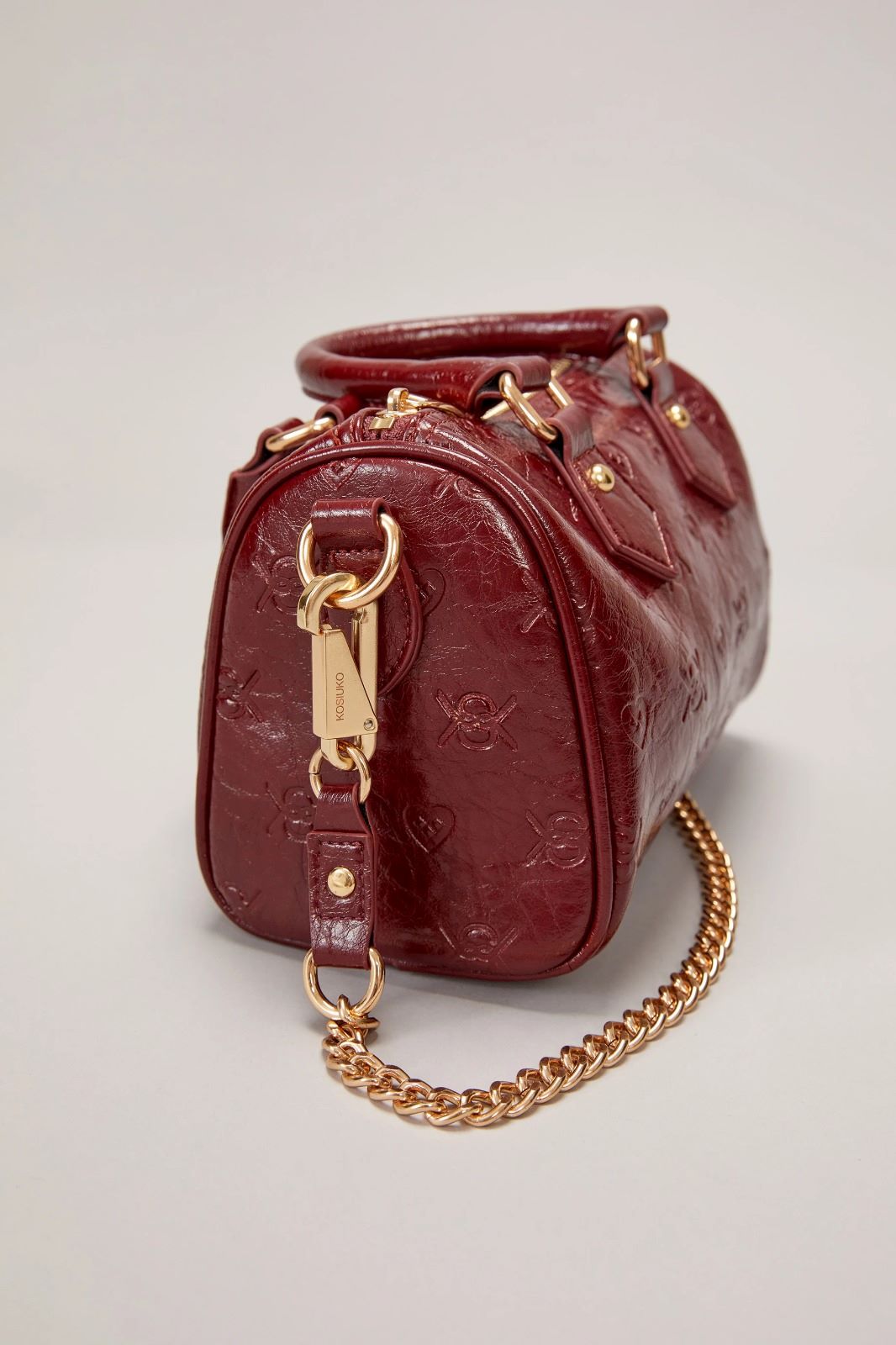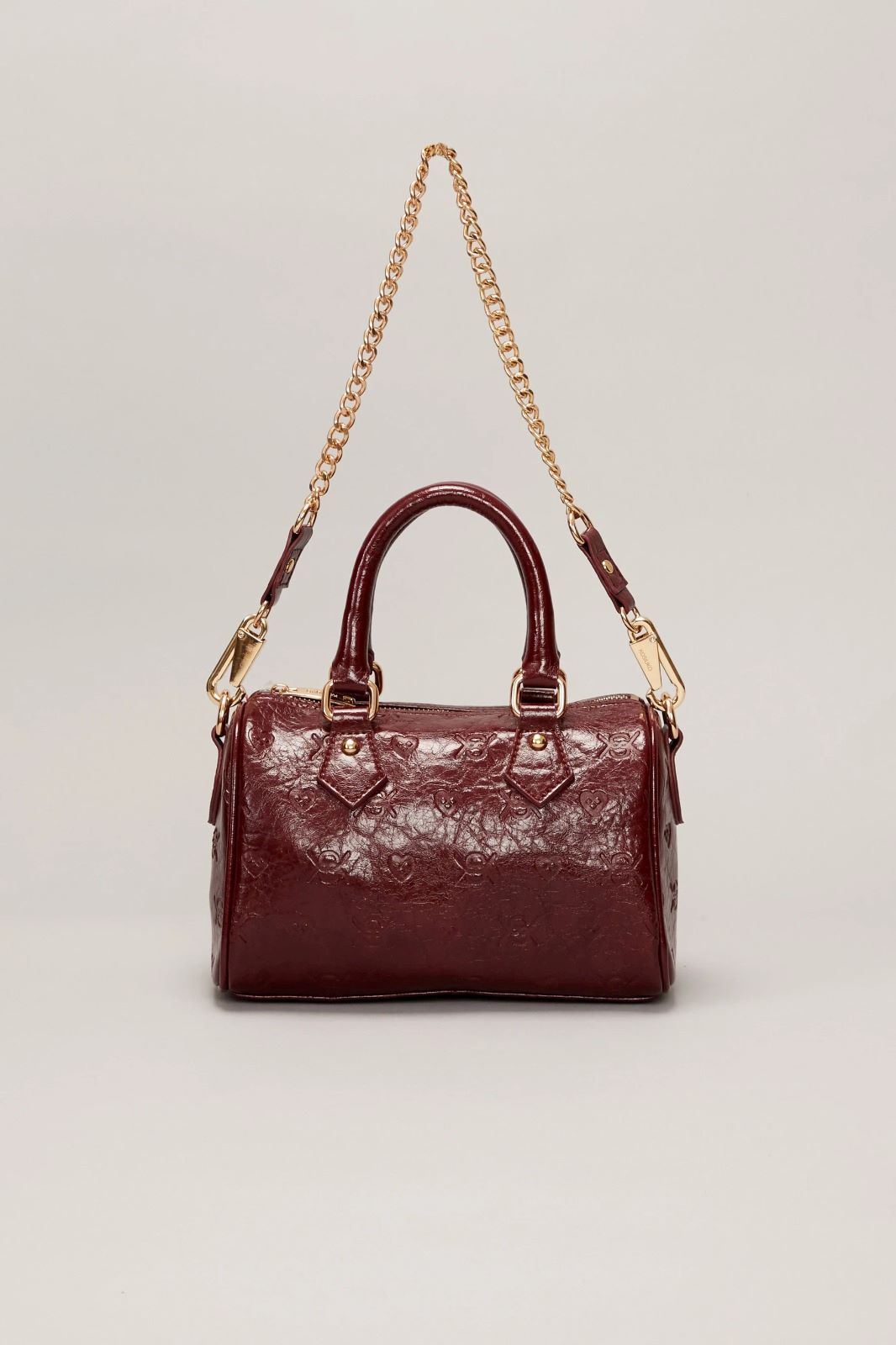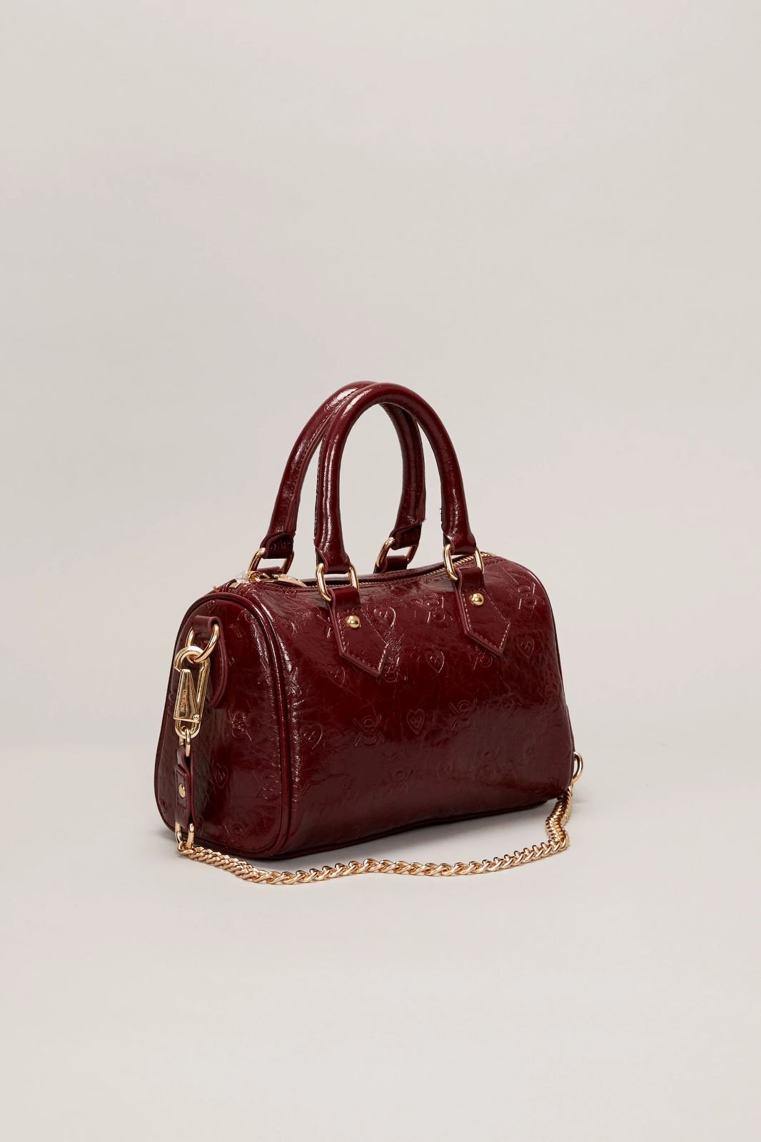 La cartera Wild Heart está confeccionada en símil cuero texturado con diseño grabado en bajo relieve que combina corazónes y el isologo de la marca. Cuenta con doble manija corta y cadena larga desmontable. Su interior está forrado y posee un bolsillo. El acceso principal es mediante cierre metálico. Medidas: altura 15cm, ancho 23cm, profundidad 11cm.