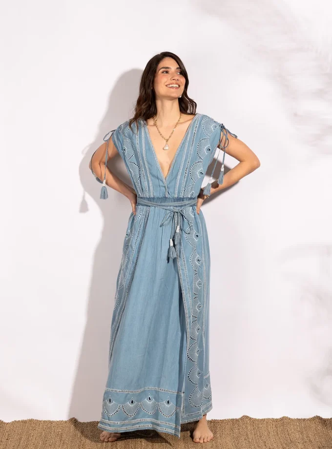 Vestido corto bordado y calado con un diseño único. Tiene botones forrados al frente y lazos con borlas en los hombros que se ajustan al cuerpo. La espalda es escotada para mostrar la piel. Es un vestido holgado y cómodo. Confeccionado en tejido simil denim 100 % rayón.
