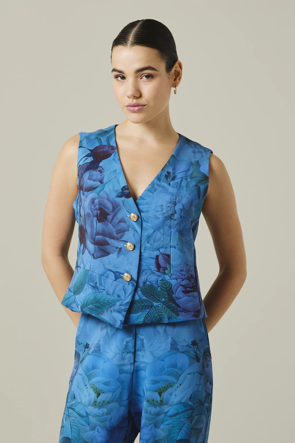 Este chaleco único combina elegancia y estilo contemporáneo con su diseño estructurado y estampado floral exclusivo. Los botones dorados en el frente añaden un toque sofisticado, mientras que el ajuste ceñido realza la silueta. Perfecto para combinar con pantalones a juego o como pieza destacada en un look moderno y refinado.