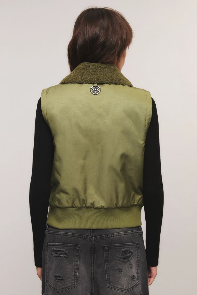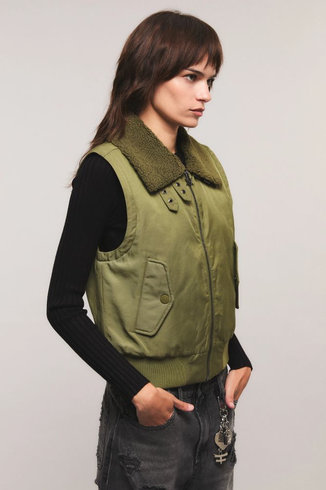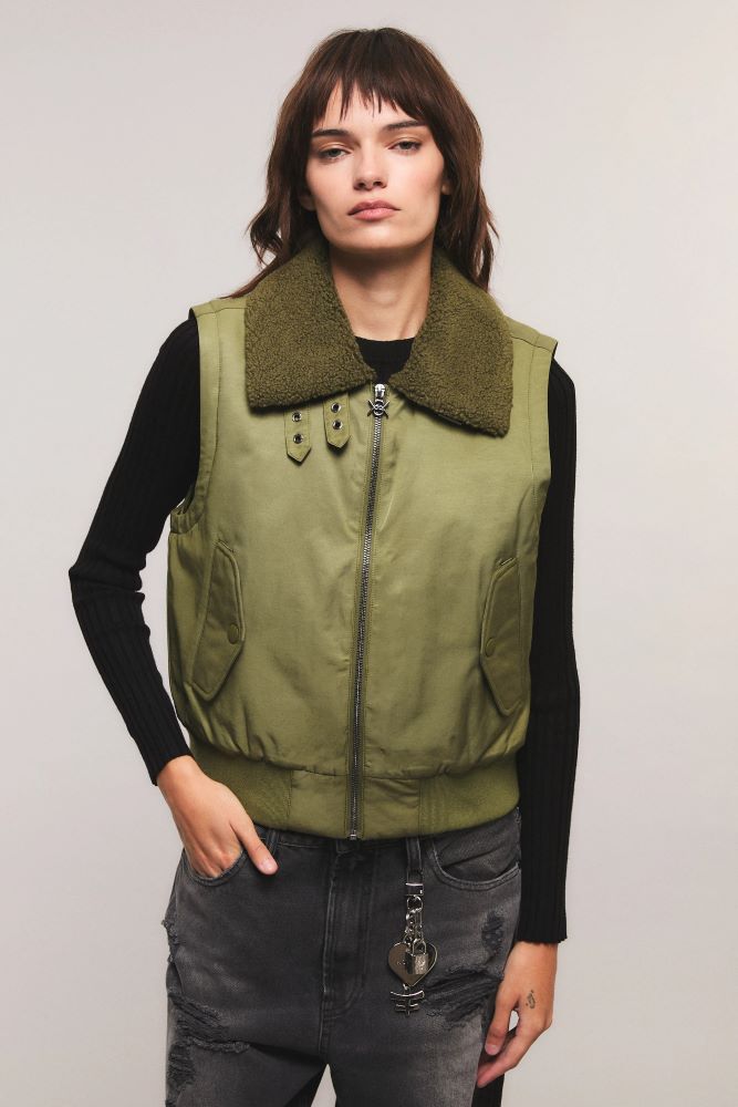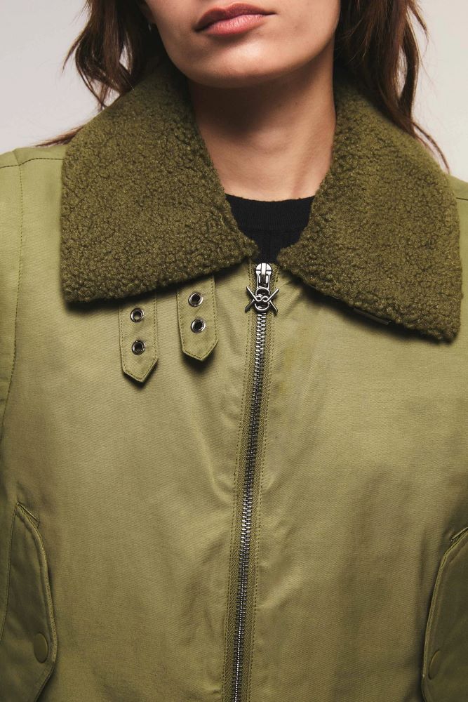 El chaleco Combat Flight es de calce regular y largo a la cintura. Presenta cuello amplio con piel sintética. Tiene un cierre frontal con avío personalizados de la marca. Cuenta con bolsillos laterales, puños y cintura de rib. Miranda está usando en la prenda superior un talle S, y en la prenda inferior un talle S/26. Sus medidas son: Altura 1.73 m. Busto 77 cm. Cintura 59cm. Cadera 85cm.