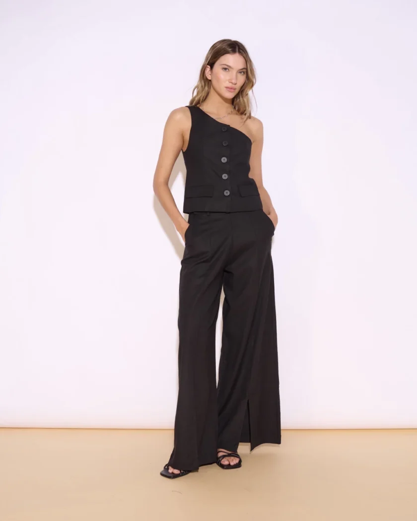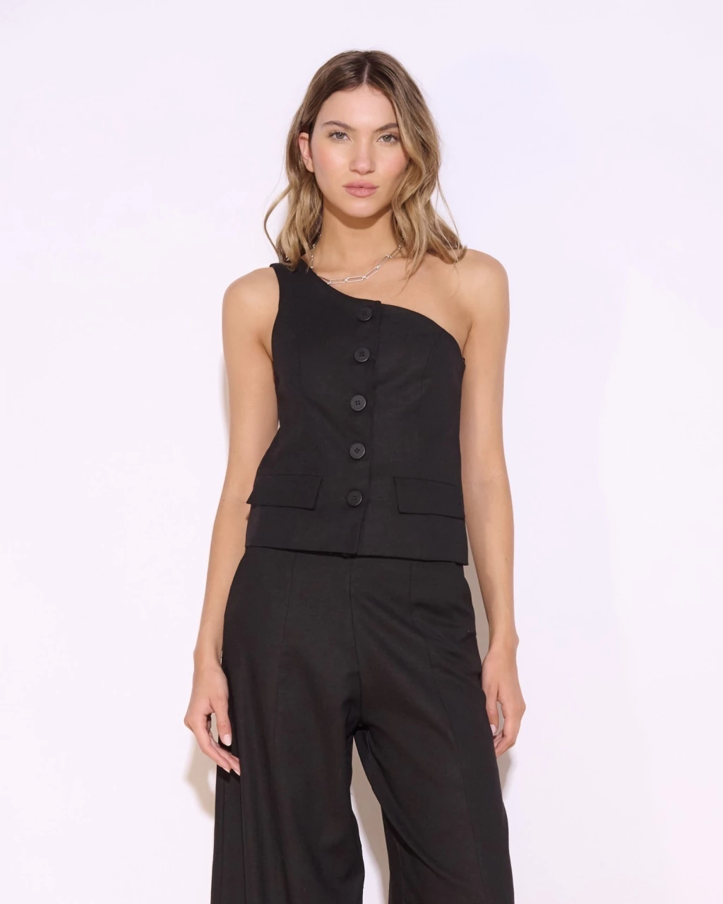 Chaleco sastrero en lino, con diseño asimétrico de un hombro y botones a tono. Cuenta con bolsillos ojal con tapa en el delantero y se encuentra íntegramente forrado.