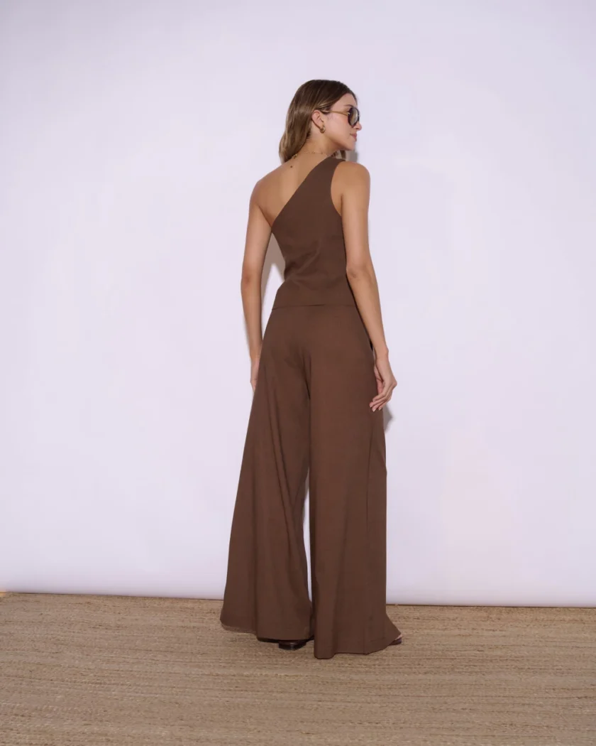 Chaleco sastrero en lino, con diseño asimétrico de un hombro y botones a tono. Cuenta con bolsillos ojal con tapa en el delantero y se encuentra íntegramente forrado.