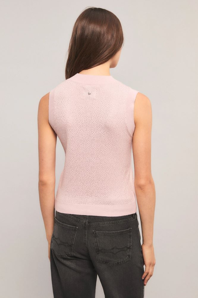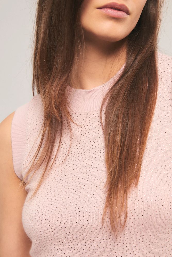 El chaleco Radiance tiene calce slim y está tejido en jersey con terminaciones en rib. Esta prenda está personalizada con delicados cristales en el delantero y la espalda. Inés está usando en la prenda superior un talle S, y en la prenda inferior un talle S/26. Sus medidas son: Altura 1.75 m. Busto 75 cm. Cintura 65cm. Cadera 90cm