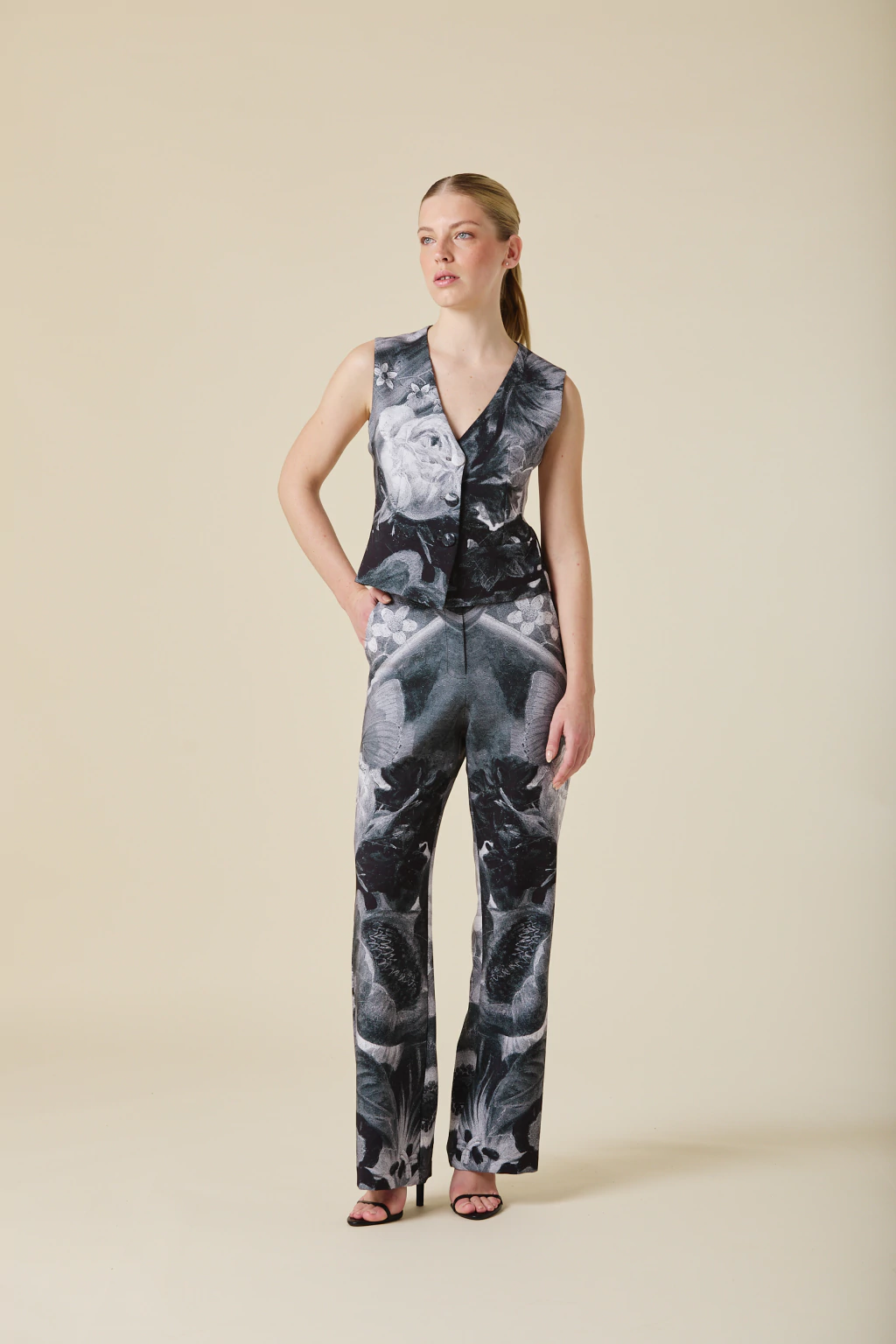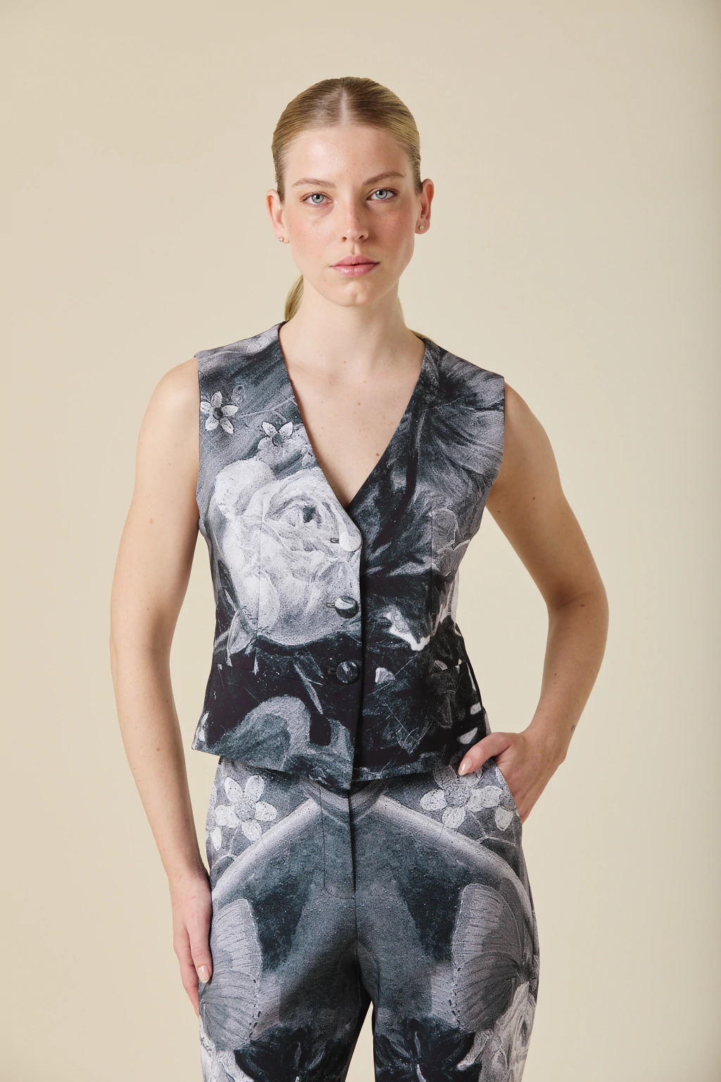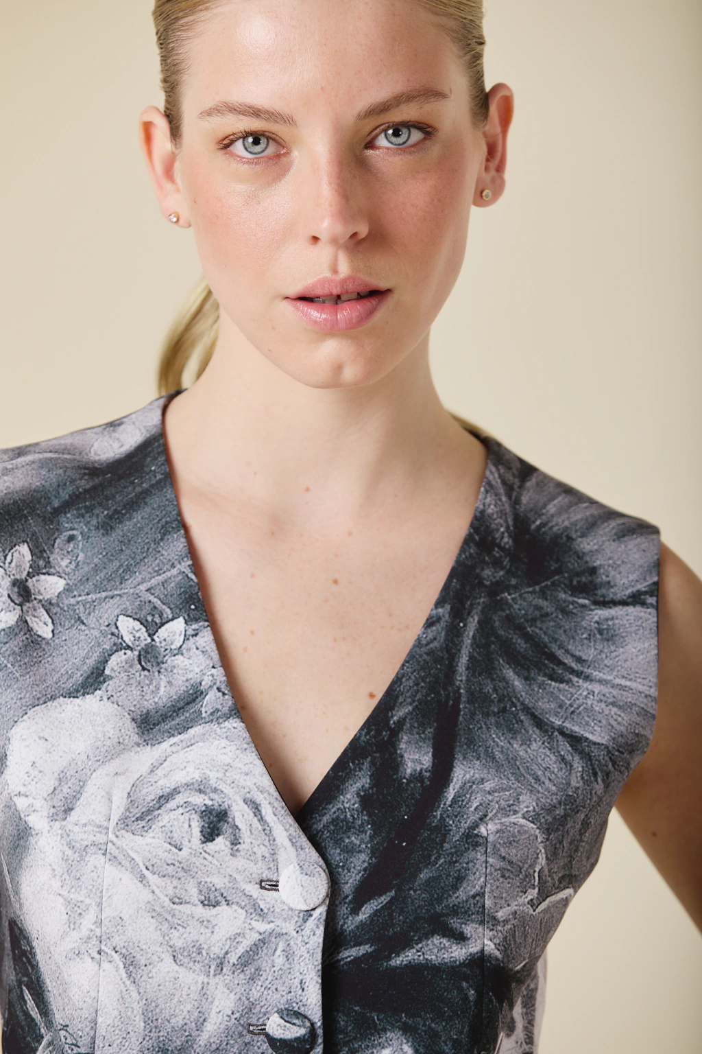 Este chaleco sastrero con estampa floral combina estructura y estilo en una prenda única. Su forrería estampada añade un detalle de distinción, mientras que los botones forrados en el mismo diseño resaltan su acabado cuidado. La modelo mide 1,72 m y usa talle S.