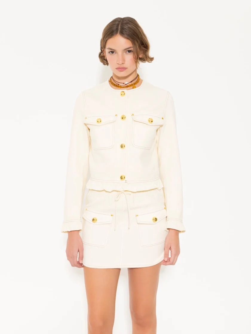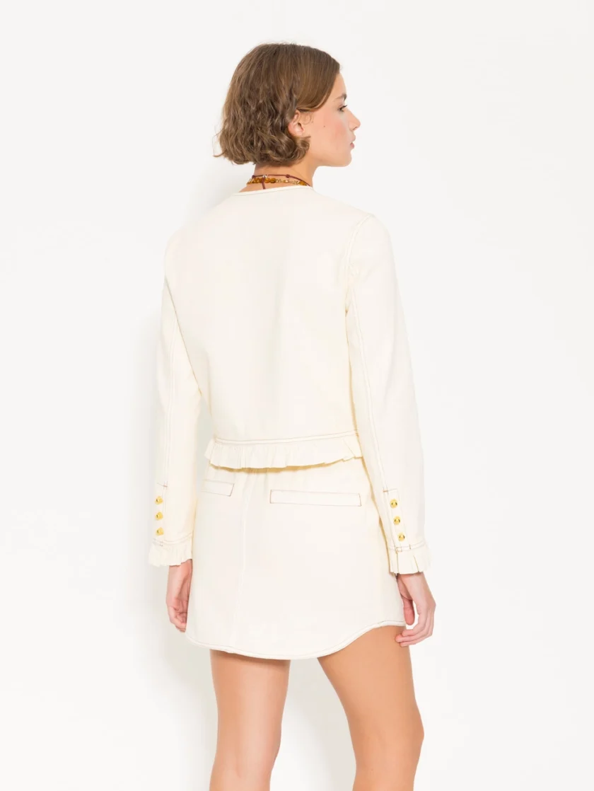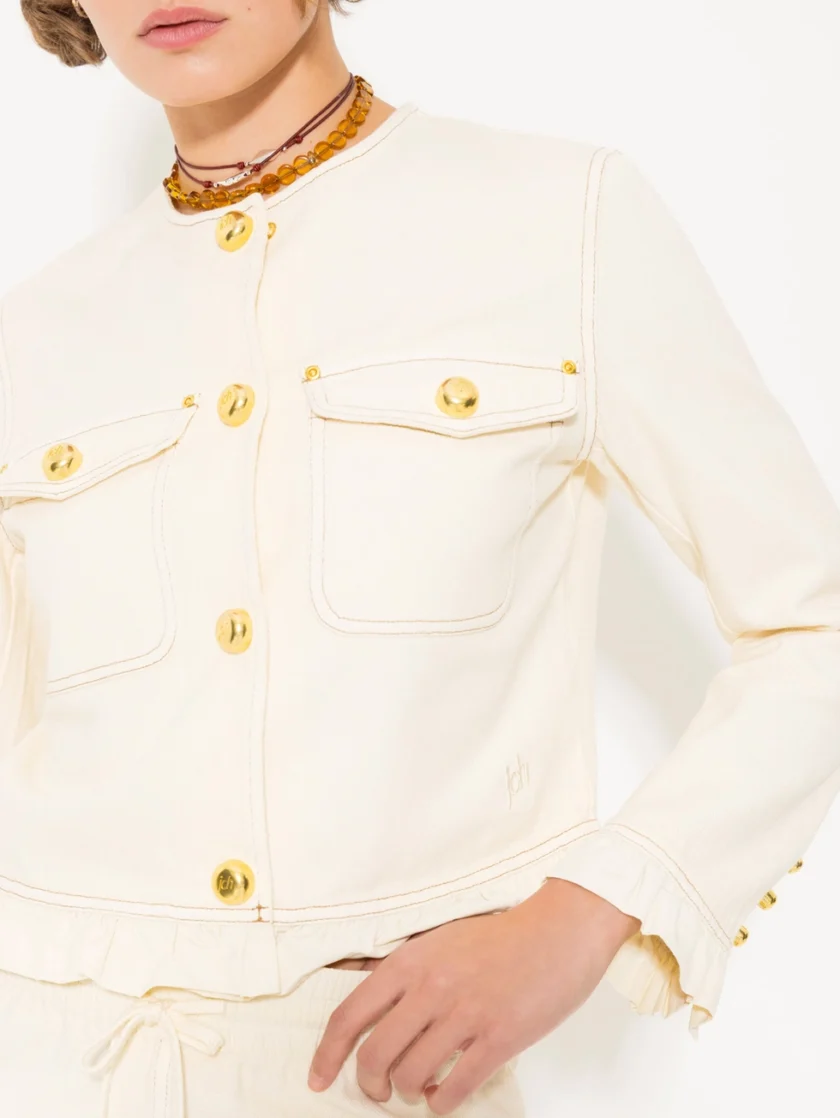 Chaqueta Blue confeccionada en denim, a la cintura, con mangas largas. Lleva volado de gabardina en puños de manga y ruedo. Incluye broches snap dorados en delantero, bolsillos y puños. Lleva JCH grabado con hilo al tono en delantero.