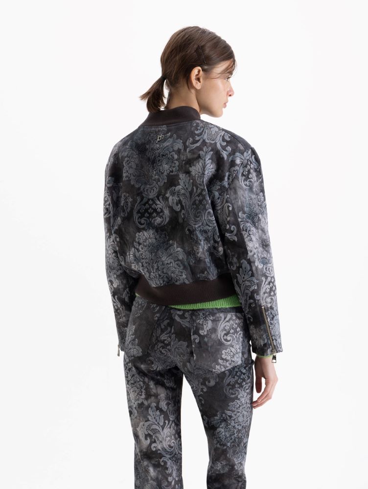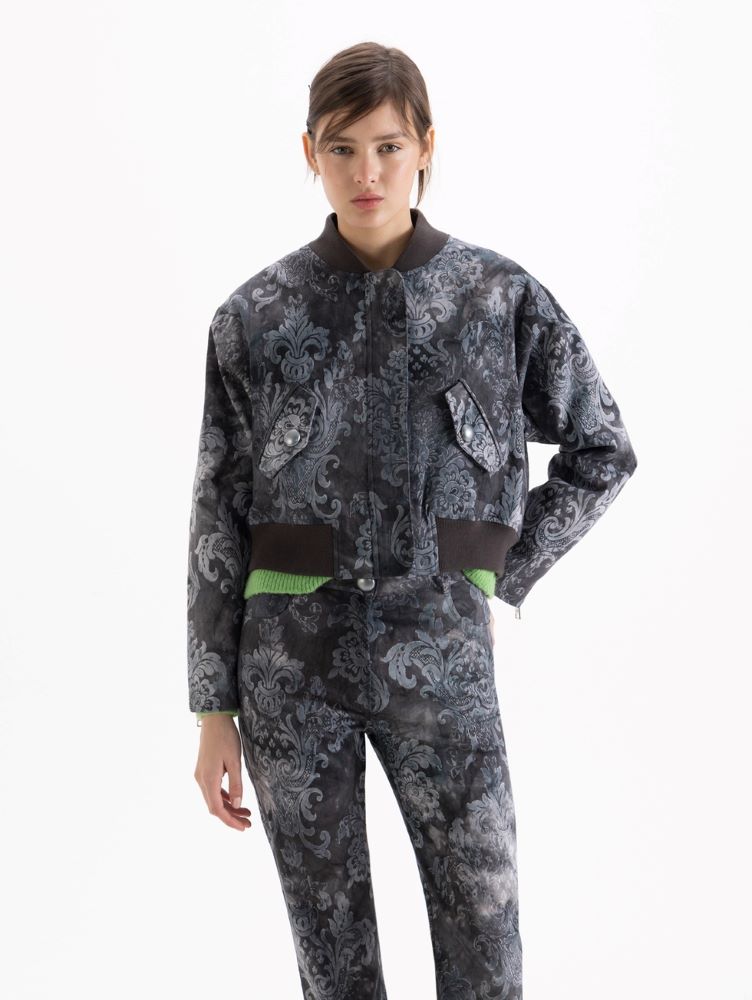 Chaqueta Swan estilo bomber realizada en gabardina estampada. Se distingue por sus bolsillos con tapa en «V» y broches en baño de plata. Sus mangas incorporan cierres que permiten regular su apertura, mientras que el cuello y el ruedo tejidos completan esta prenda.