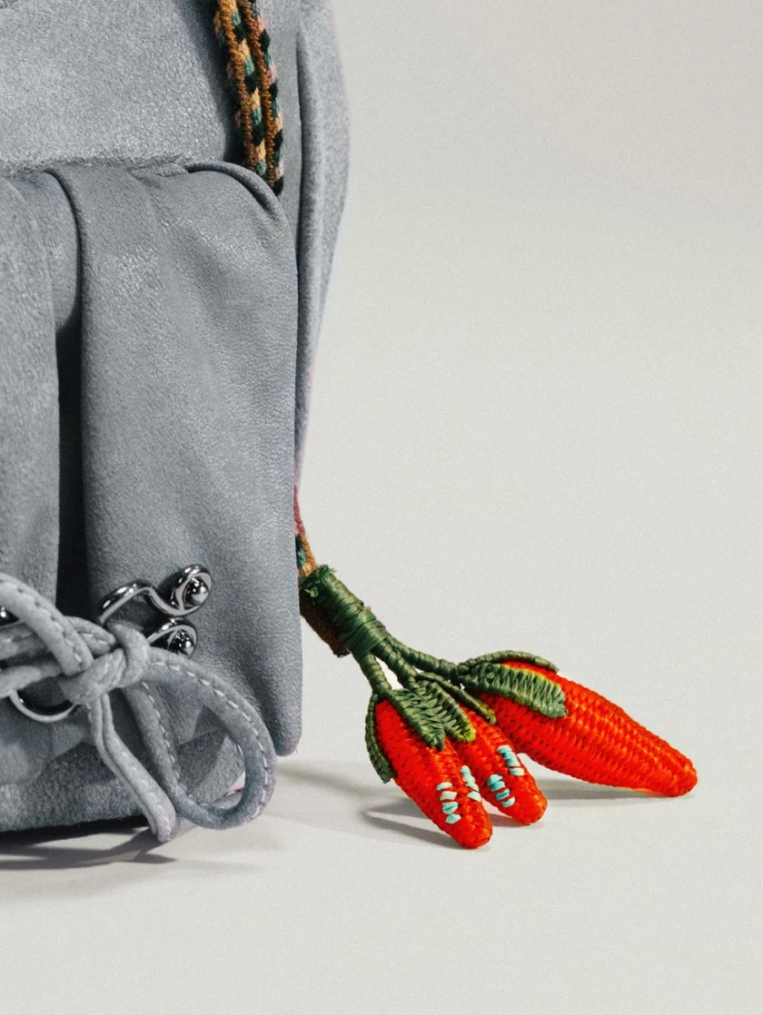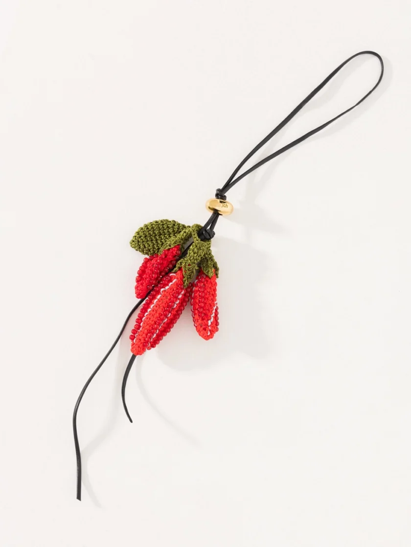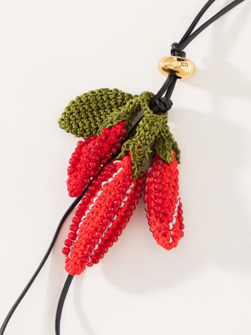 Charm Peperoncino tejido artesanalmente con un diseño colorido y original. Incluye tiento de cuero y avío metálico, pensado como accesorio único para complementar tus looks.