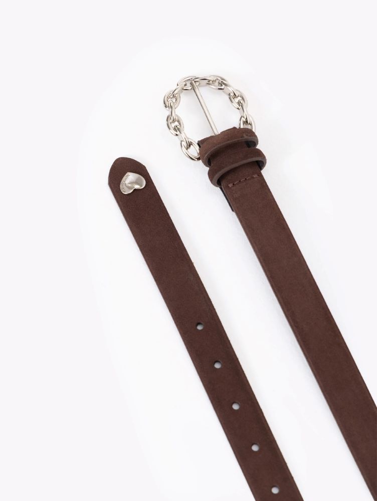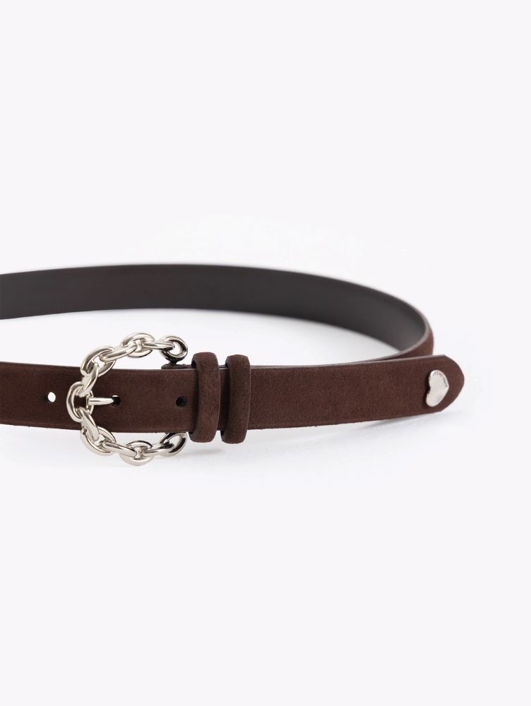 Cinturón Darcy realizado en cuero descarne vacuno, caracterizado por su hebilla trenzada y un aplique de corazón.