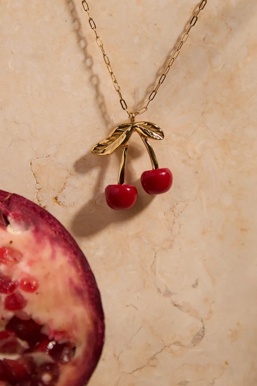 Collar en forma de cadena, de metal dorado, con dije colgante en forma de cerezas.