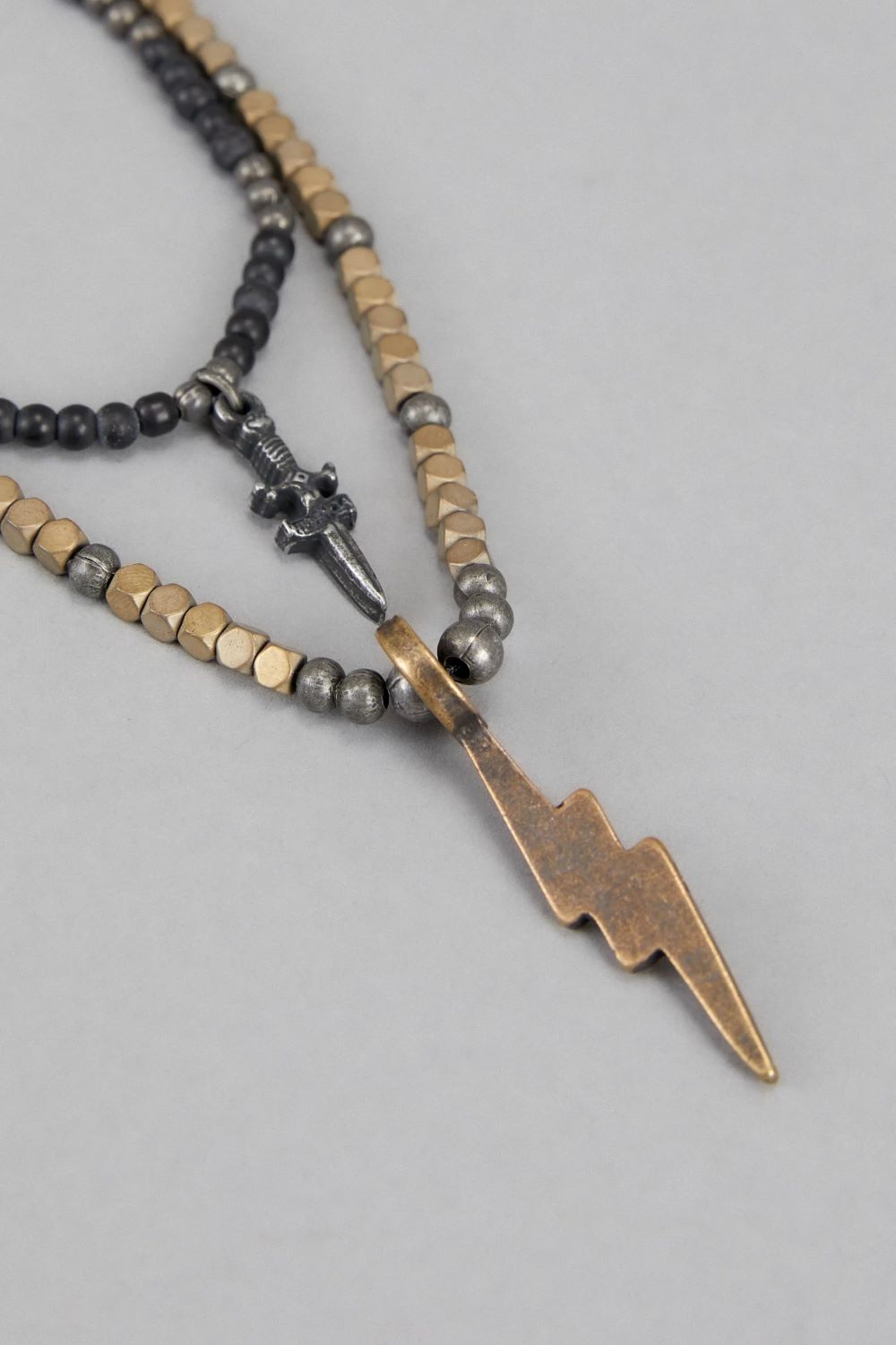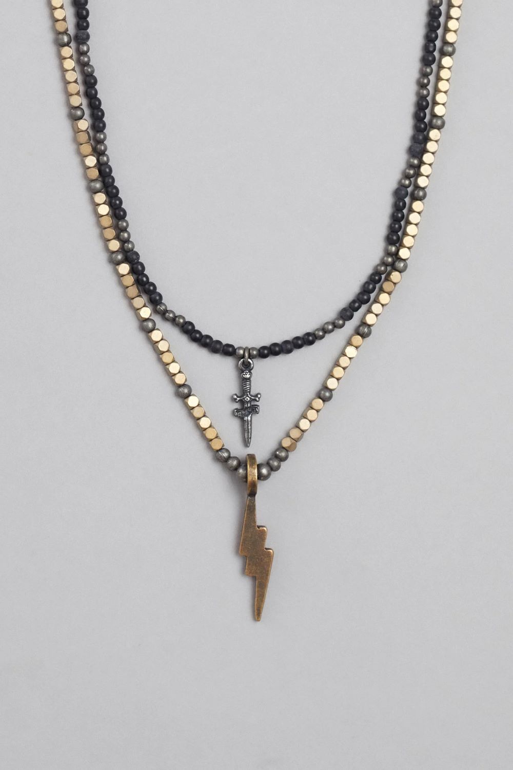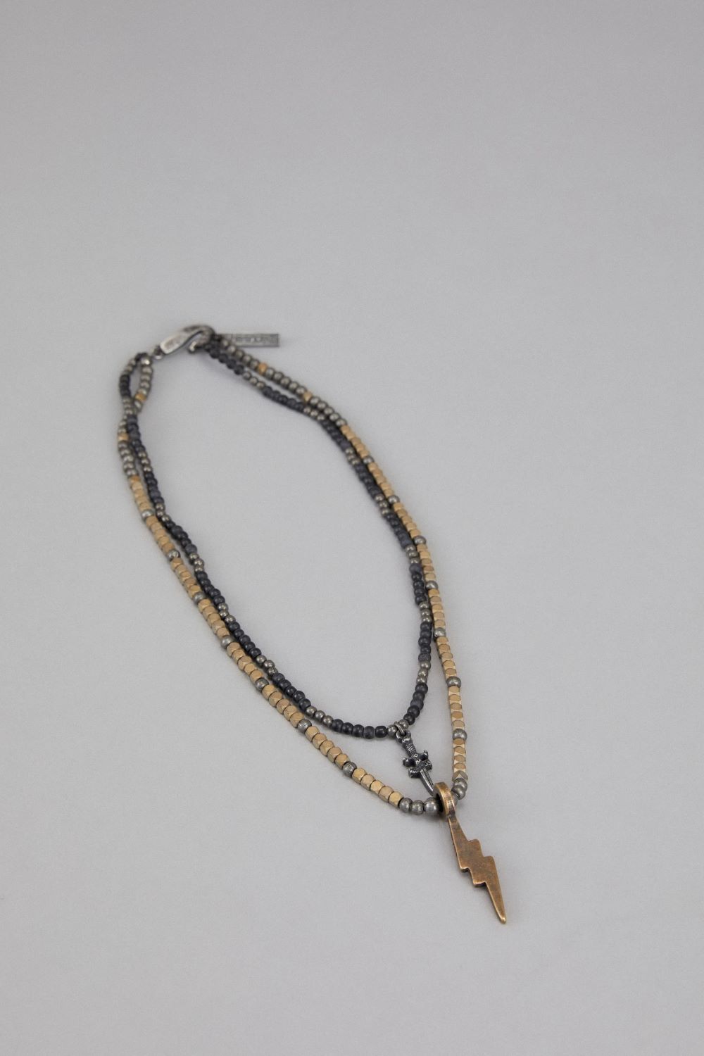 El collar odinis combina dos collares, uno de ellos con mostacillas en piedra dorada y metal y dije personalizado herencia, el otro hecho en mostacillas de piedra negro con un dije personalizado de un rayo. Largo 33cm.