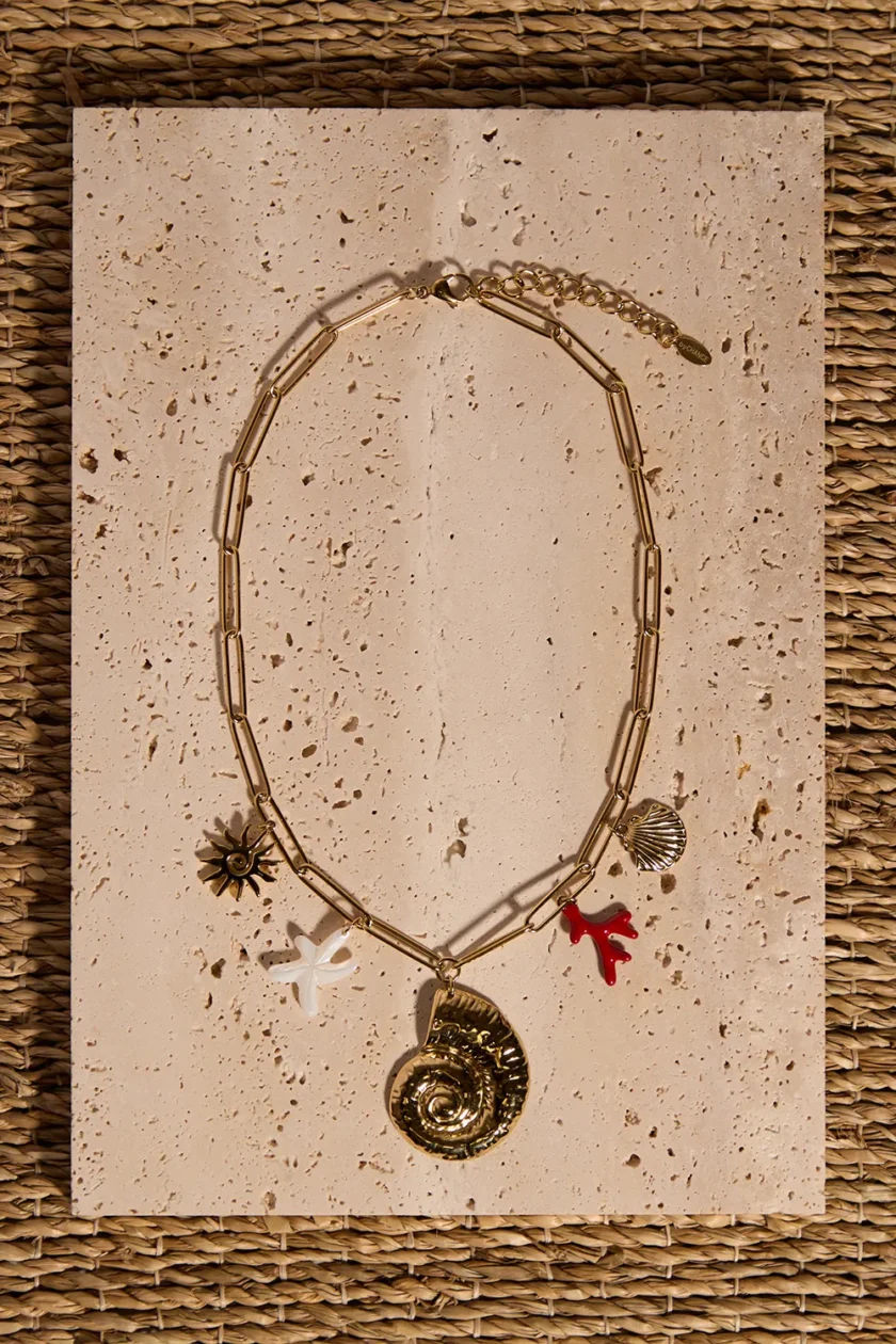 Collar con eslabones de metal dorados, con cinco dijes de motivos marinos.