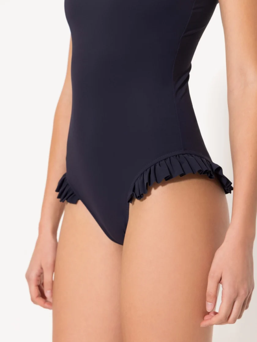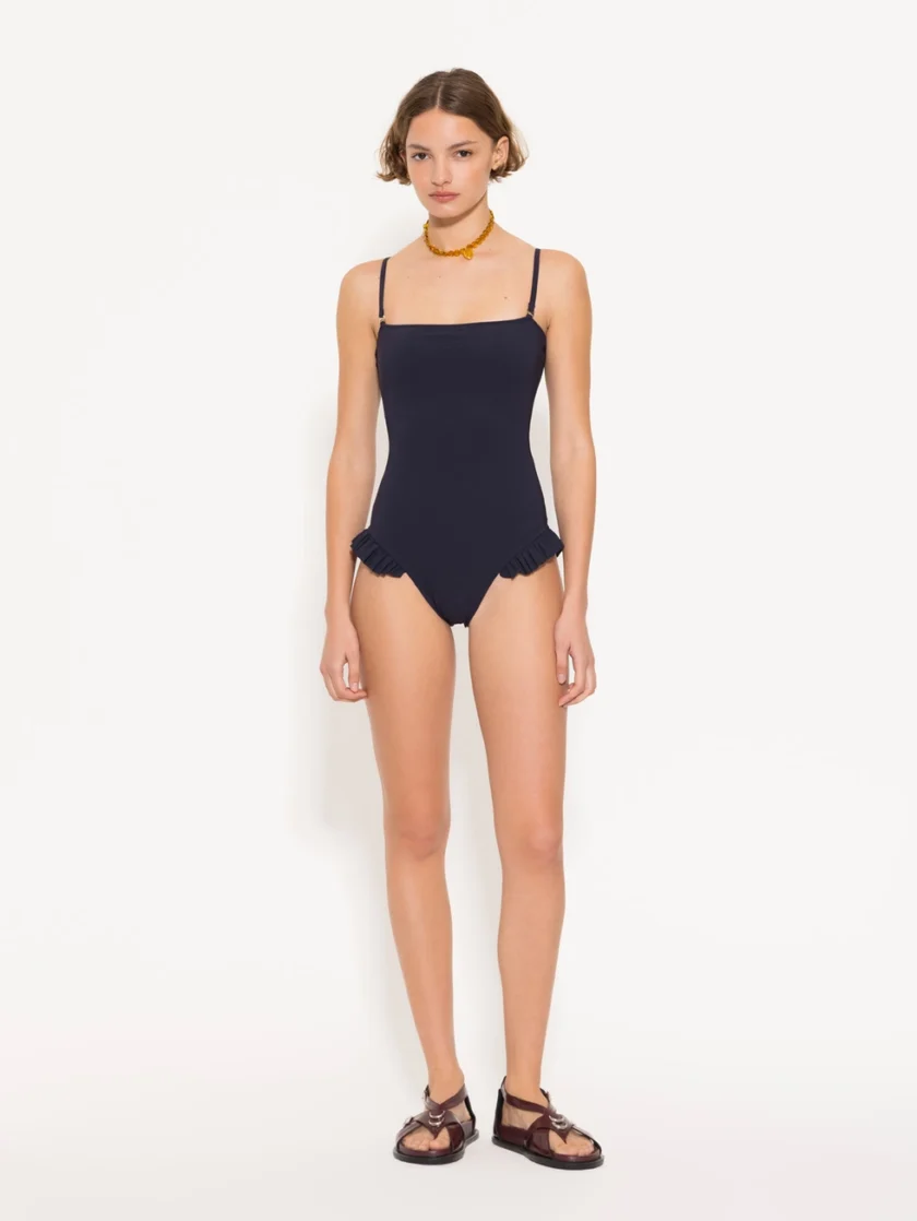 Entero Ámbar con escote recto y breteles desmontables. Presenta voladitos en la cadera que aportan movimiento y un aire lúdico. Ideal para un look de playa elegante y femenino.
