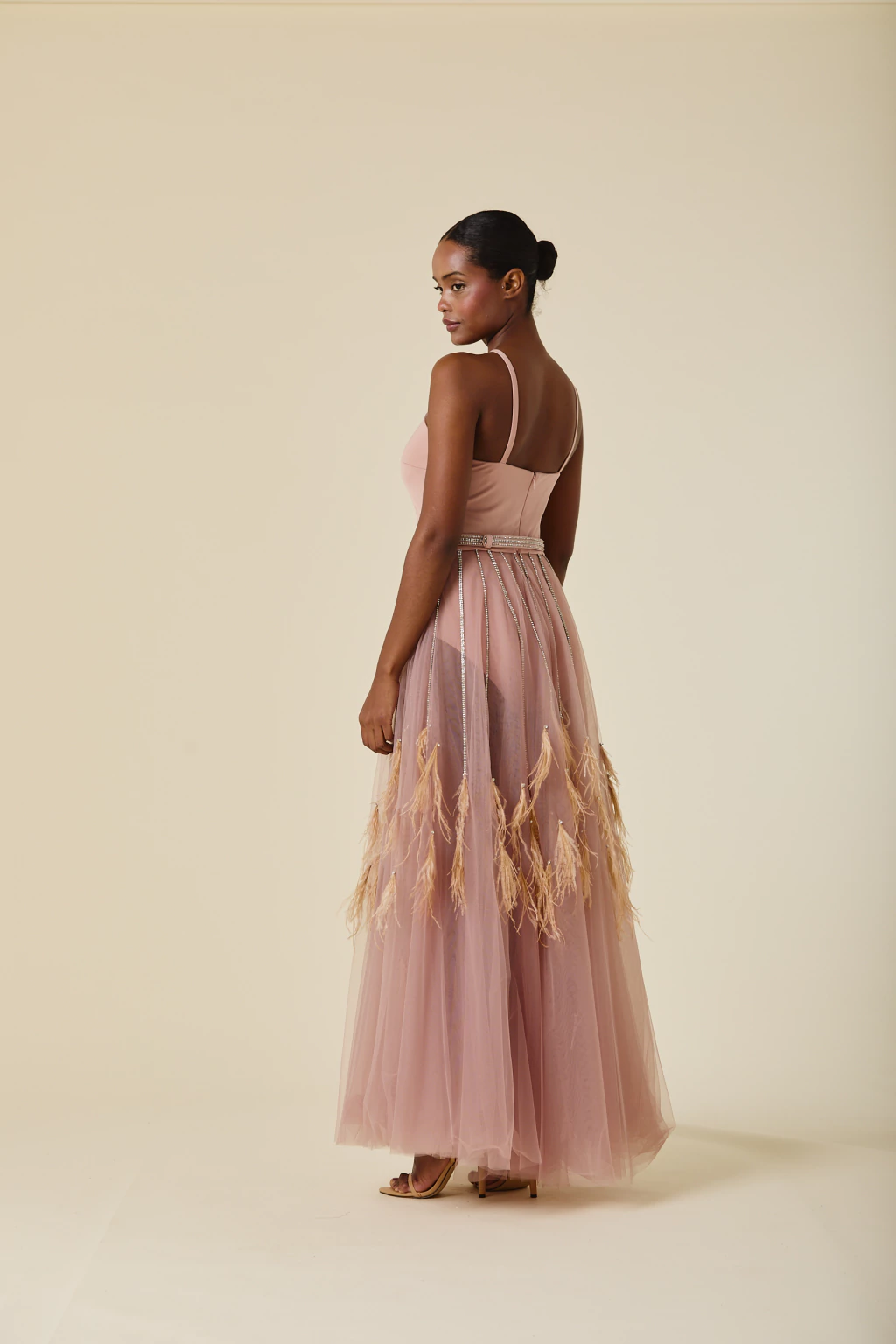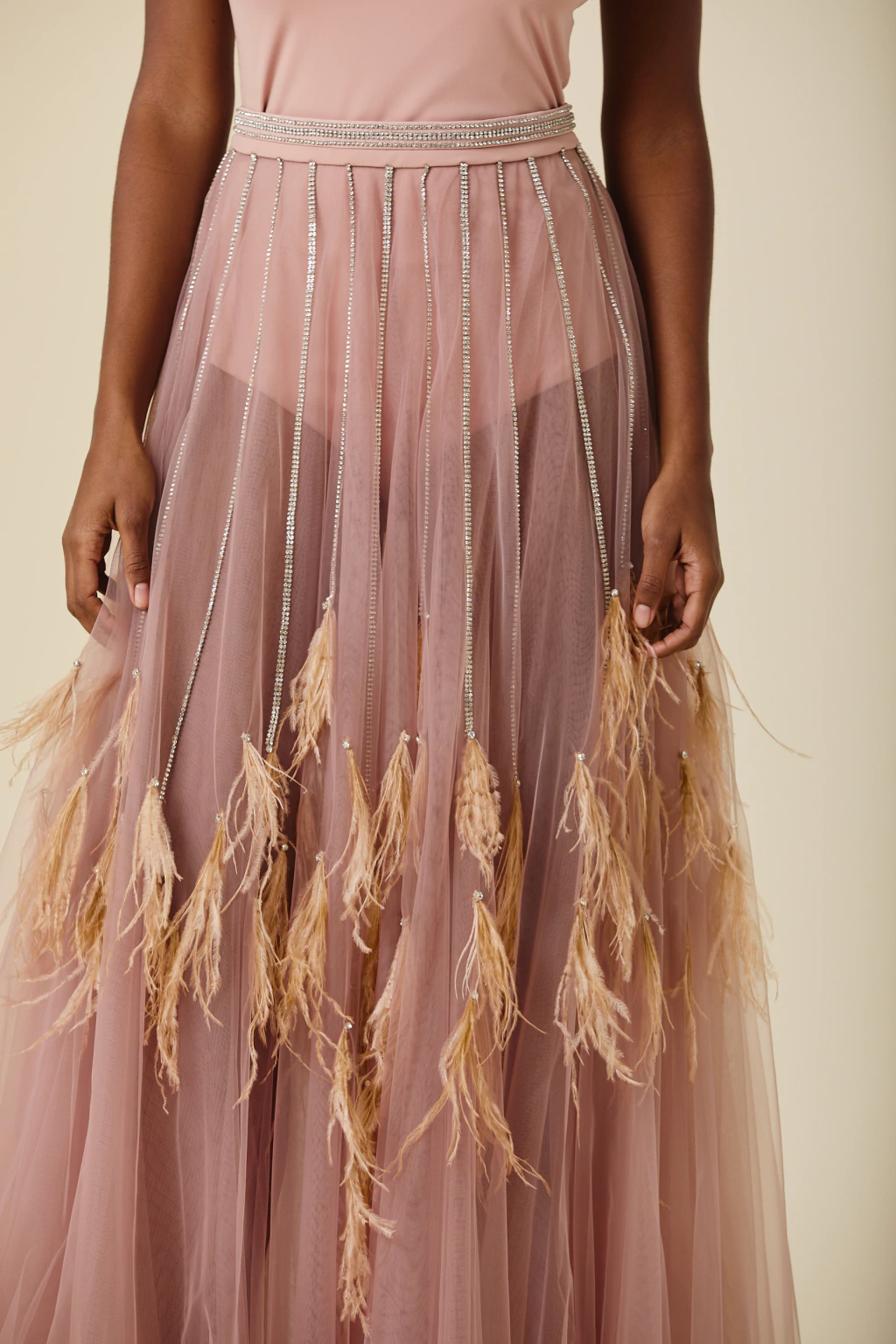 De espíritu etéreo y elegante, esta falda confeccionada en tul liviano presenta bordados en líneas verticales de cadenas de strass que estilizan la figura, y delicadas plumas al tono que aportan movimiento y textura. Cintura alta con terminación limpia que enmarca la silueta y aporta un toque contemporáneo a una pieza de inspiración romántica.